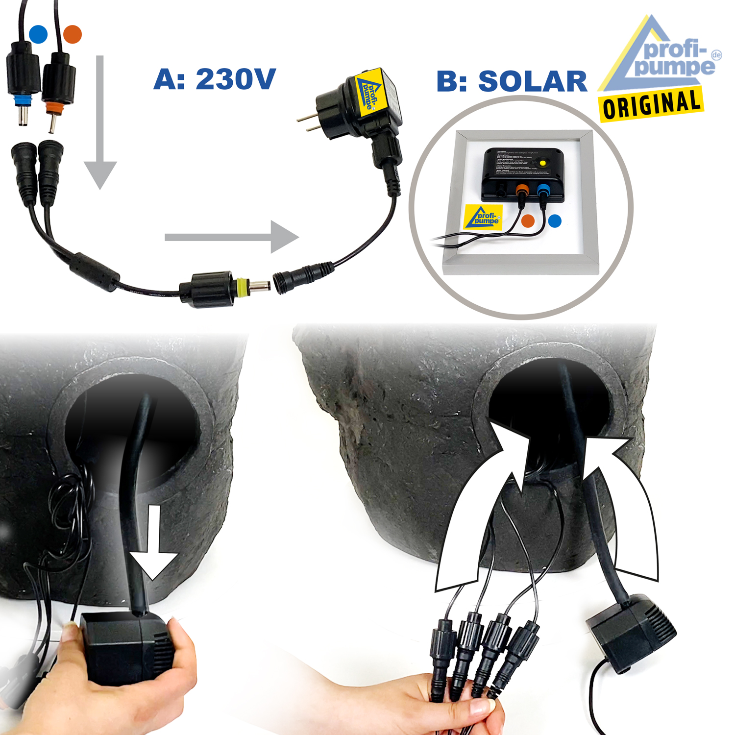 Der rustikale Zierbrunnen FELS-KASKADE RGB als Basisversion ist für den 230-Volt-Betrieb vorgesehen. Die Pumpe und die LEDs werden mit sicherer 12V-Niederspannung betrieben (Adapter im Lieferumfang enthalten). Alle Kabelverbindungen sind verpolungssicher und wasserdicht. Der Aufbau geht einfach und schnell.