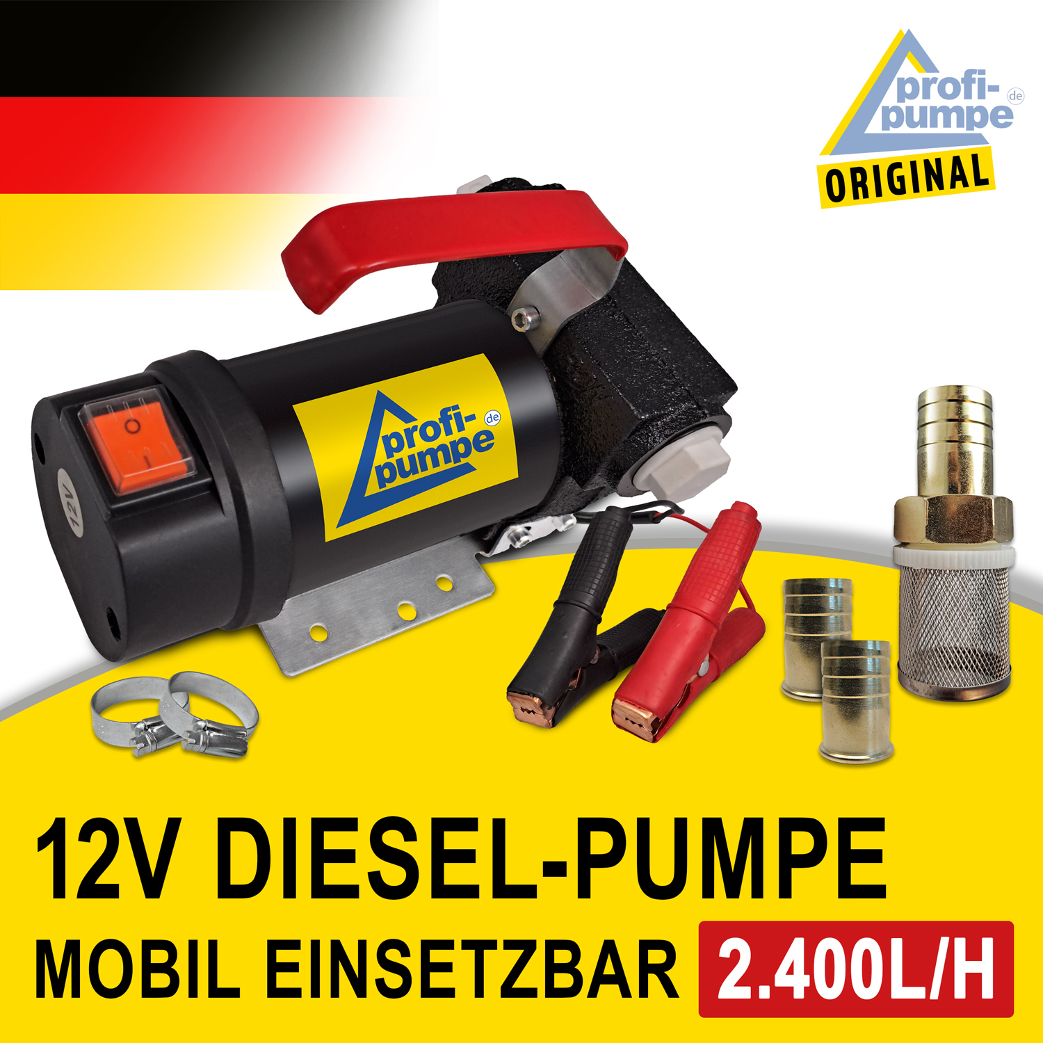 Dieselpumpe mit 2 Tüllen und mit Klemmen zum Anschluss an 12-Volt-Batterie