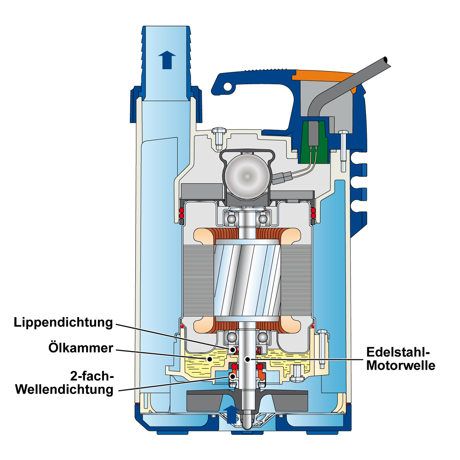 • Flachabsaugende Klarwasser- und Schmutzwasser-Tauchpumpe (Partikelgröße bis ca. 2 mm)
