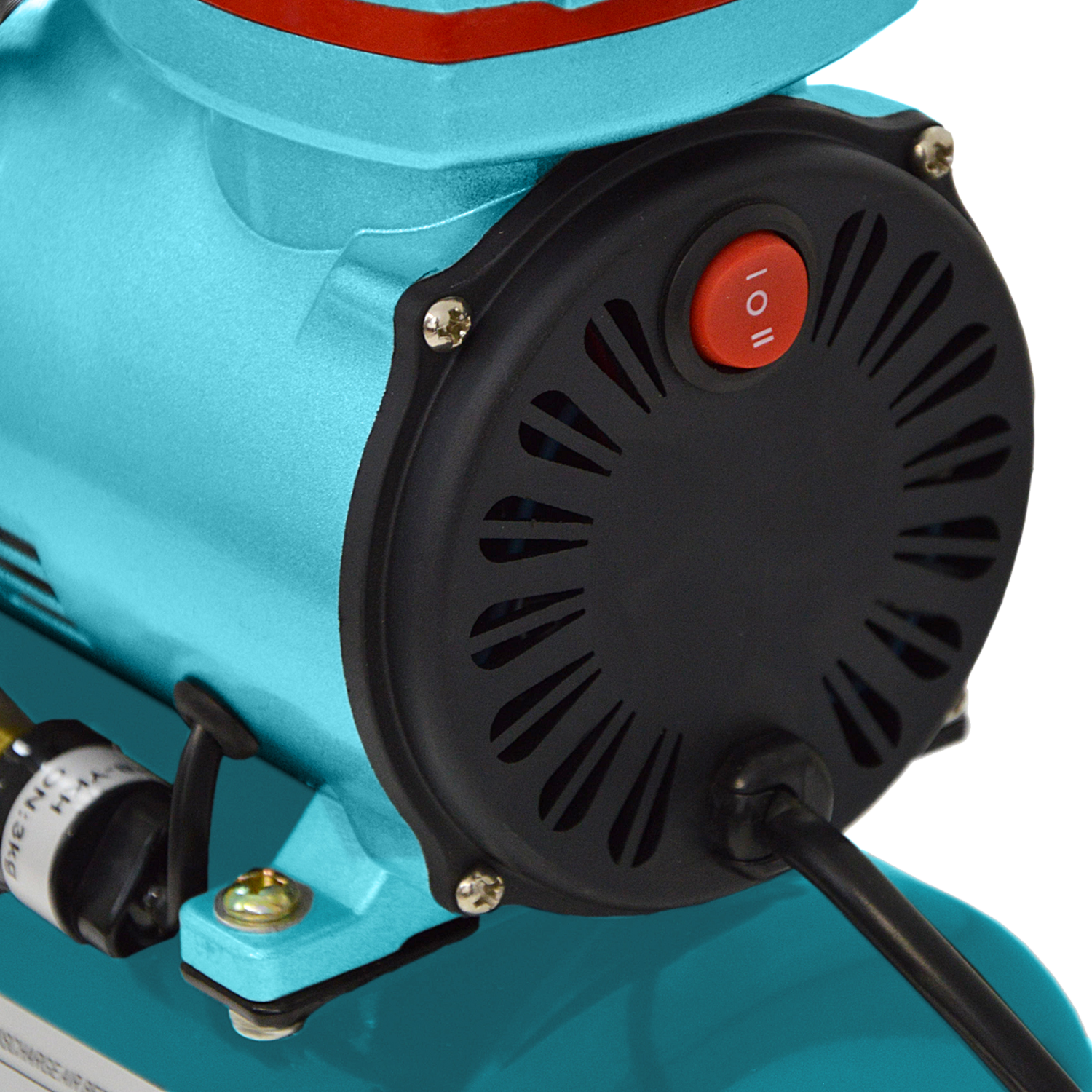 Ausgestattet ist der Airbrush Kompressor mit einem Tragegriff, einer Auto-Stop-Automatik, einem Manometer, einem Wasserabschneider, einem integrierten Durchfluss- und Druckregler und einem Luftdrucktank mit einer Druckluftreserve von 3,5 Litern.