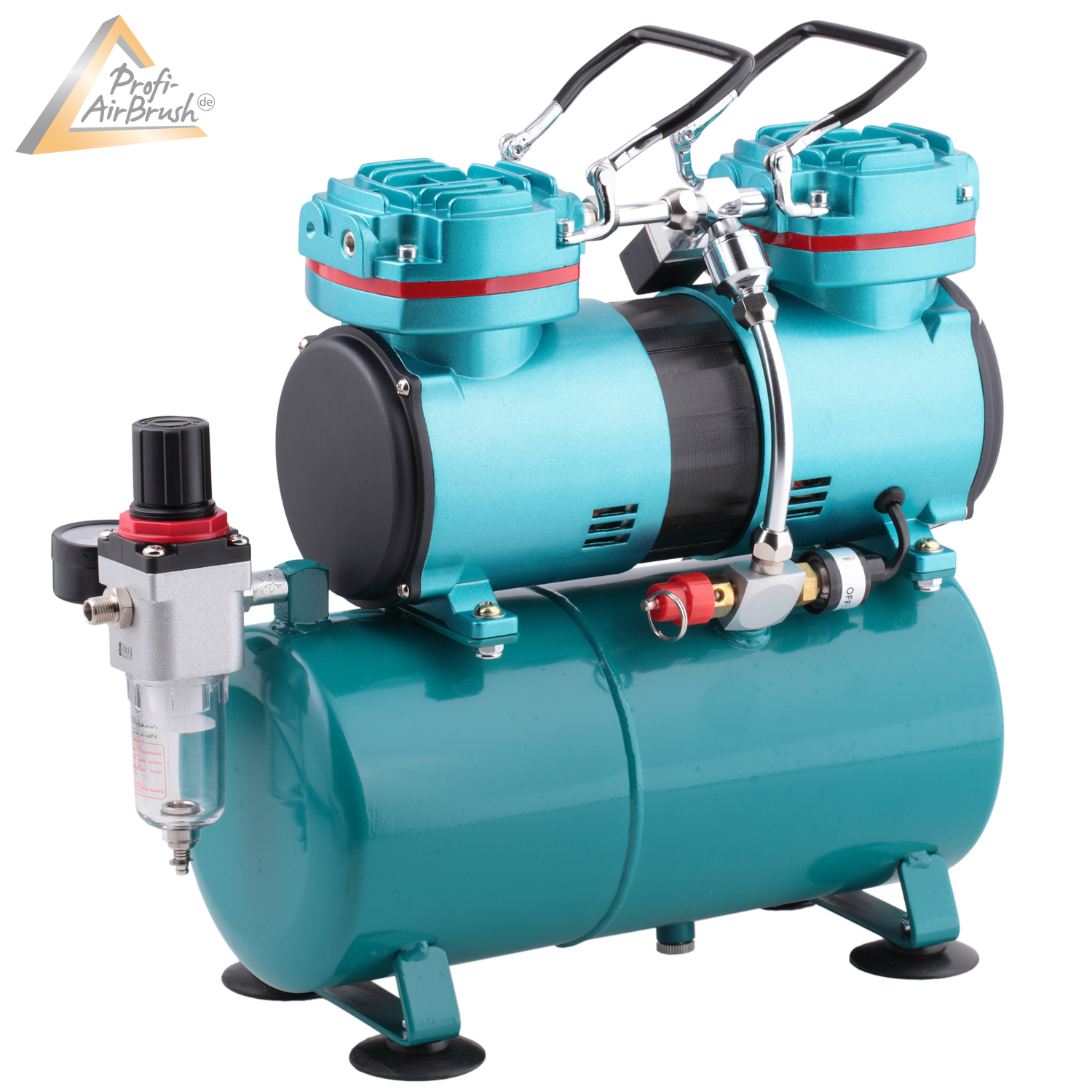 Dieser Dieser öl- und wartungsfreie Airbrush Kompressor DUO-POWER II ist ein Zwei-Zylinder-Kolben-Kompressor mit Lufttank und einer Druckluftreserve von 3,5 Litern. Der Airbrush Kompressor ist für Arbeiten mit allen handelsüblichen Airbrush-Pistolen und Airbrush-Farben geeignet. Mit nur 50 dB ermöglicht er angenehmes, leises Arbeiten auch in kleineren, geschlossenen Räumen.
