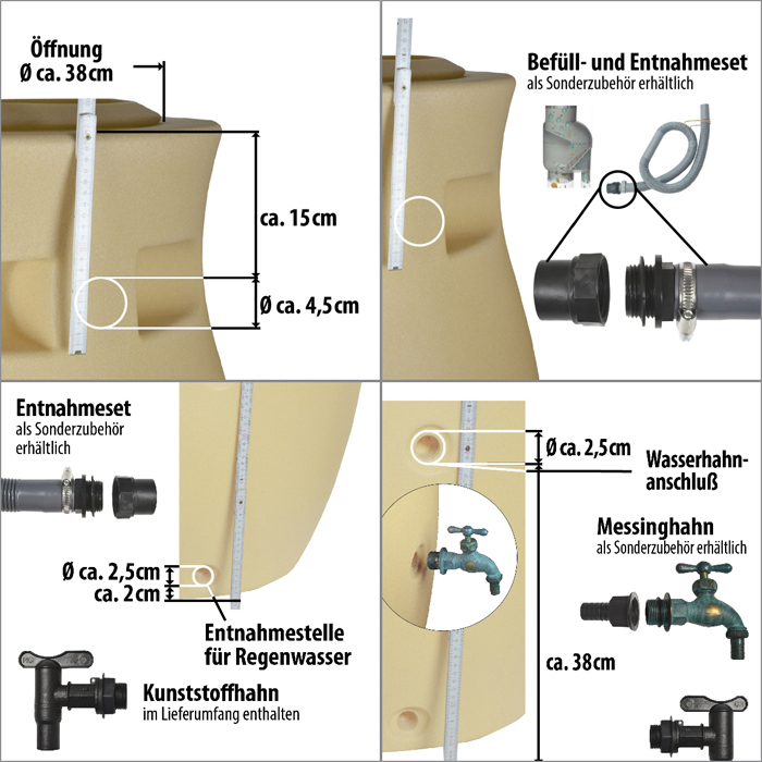 Zum Zubehör der Regentonne gehören ein passender Deckel sowie ein Auslaufhahn aus PE-Kunststoff in schwarz. Der Deckel der hochwertigen Regentonne ist mit einer integrierten Pflanzschale ausgestattet. Mit der intergrierten Pflanzschale können Sie die in zwei Farben (terra-kotta, beige-gelb) und zwei Größen (300l, 500l) erhältliche Regentonne individuell gestalten. Der Auslaufhahn für Regentonnen hat einen 3/4-Zoll-Anschluss. Er kann optimal an den dezent vorgeformten Stellen am Regenfass für den Wasser-Zu- und Ablauf angebracht werden. Zur hochwertigen Regentonne erhalten Sie außerdem einen Füllstandschlauch inklusive Befestigungsmaterial.
