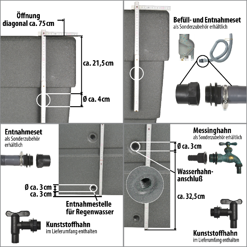– Befüll- und Entnahmeset (Lieferung inkl. Filter T33 und allem Zubehör, wie oben sowie dem Entnahmeset, mit dem Sie das Wasser aus der Tonne restlos entnehmen können).