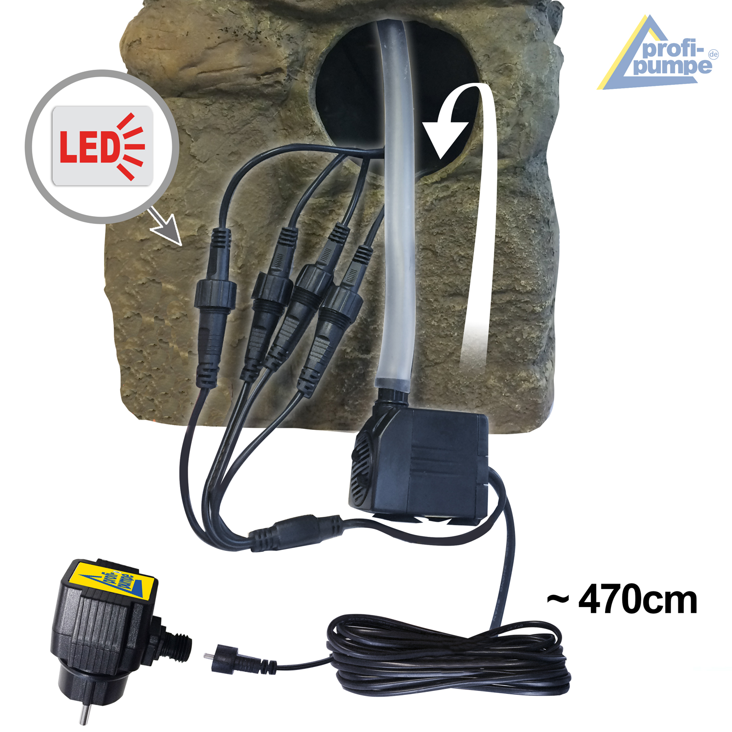 - Mit 230V/12V-Anschluss, 2 Watt Pumpe und LED-Ring in warmem Weiß