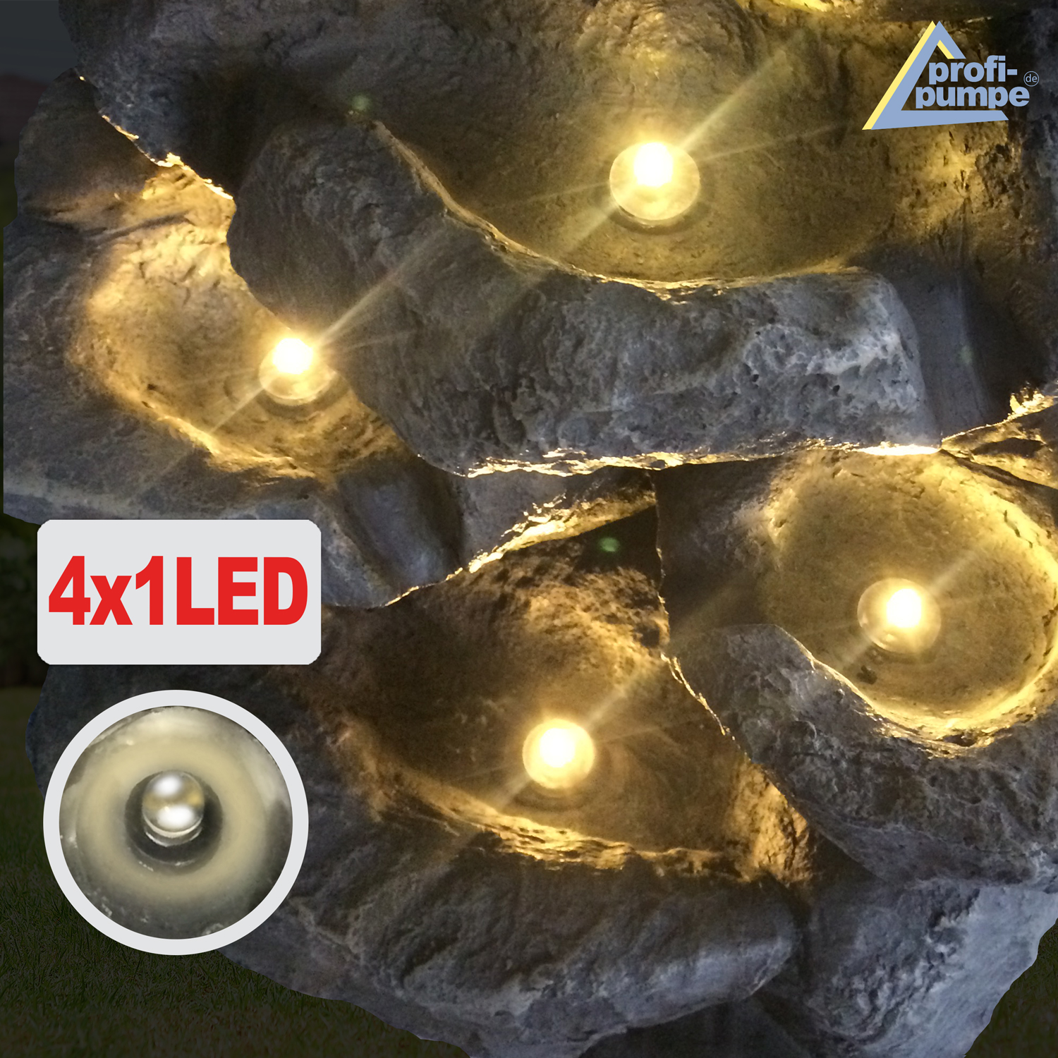 Gartenbrunnen FELS-ZAUBER mit LED-Ring (4×1 warm weiß) und 230/12V-Netzadapter. Für den Innen- und Außenbereich.