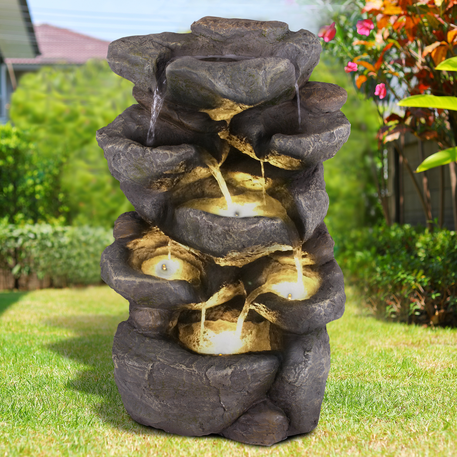 Der Garten- und Zimmerbrunnen “FELS-ZAUBER” mit der LED-Beleuchtung ist für den Innen- und Außenbereich geeignet. Der mehrstufige Kaskadenbrunnen in Fels-Optik sorgt für eine tolle Atmosphäre und Entspannung, wertet jede Umgebung und belebt Wohnzimmer, Esszimmer, Flure und Eingangsbereiche, Wintergärten oder Balkone, Terrassen und Gärten im privaten wie gewerblichen Umfeld. Fließendes Wasser wirkt sich positiv auf die Stimmung aus und liefert ein angenehmes Mikroklima an heißen Sommertagen. Die naturgetreue Optik und die weiße LED-Beleuchtung machen den Brunnen Tag und Nacht zum perfekten Blickfang.