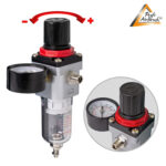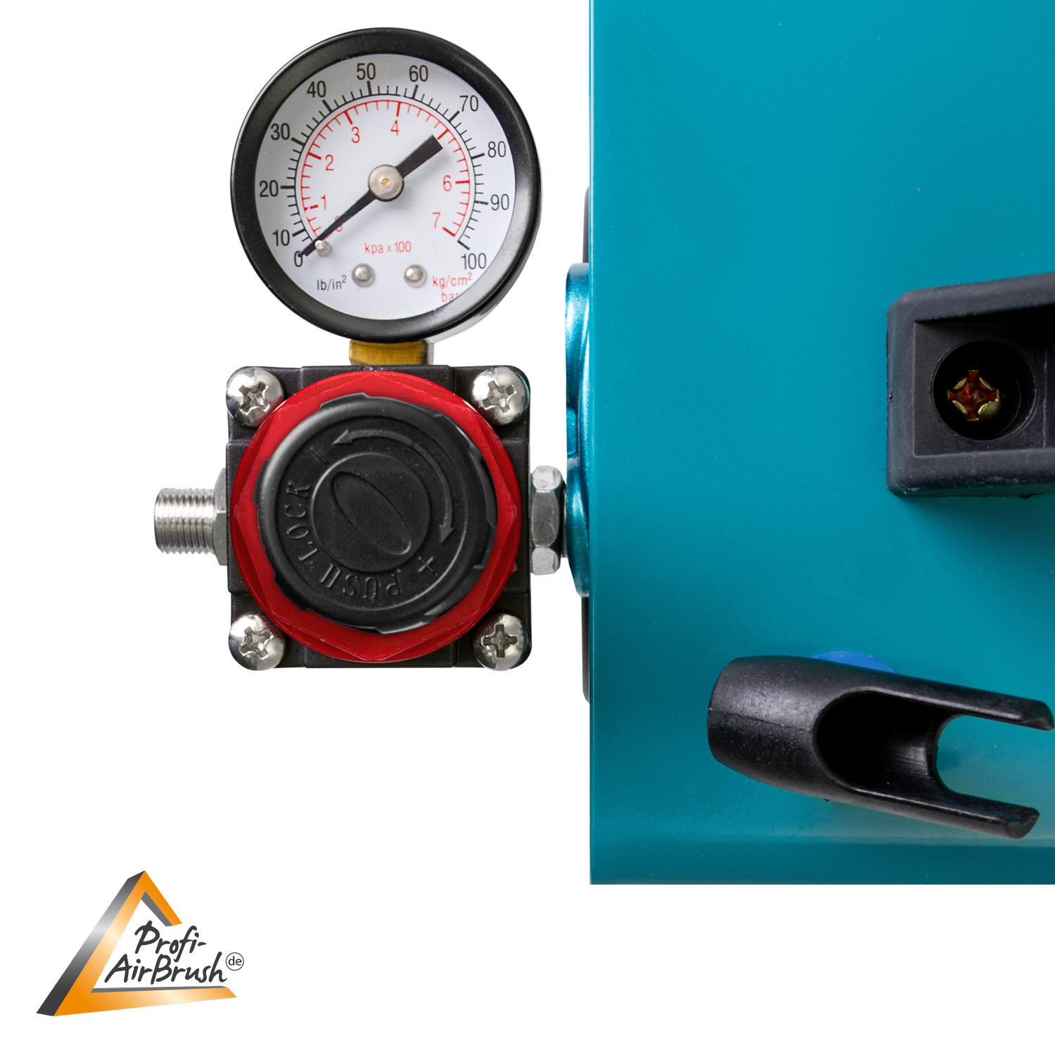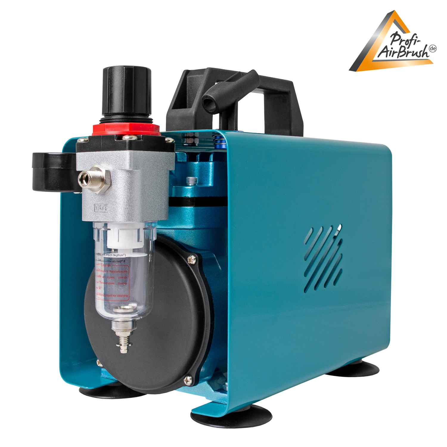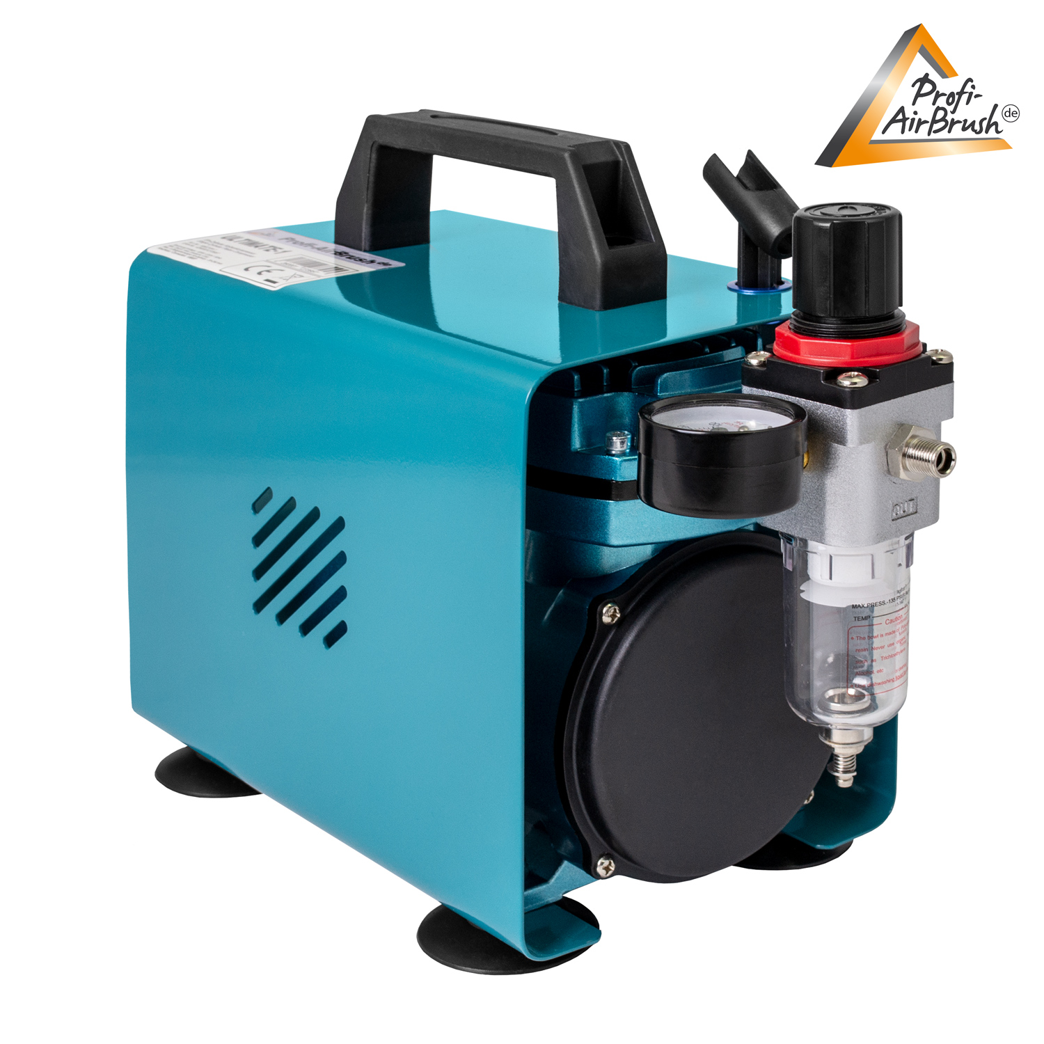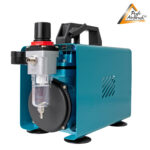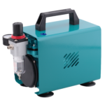Es handelt sich um einen energieeffizienten Einzel-Zylinder-Kolben-Kompressor für Airbrush. Er hat einen integrierten Manometer, einen integrierten Luftfilter, einen integrierten Wasserabschneider sowie einen integrierten Druck- und Durchflussregler.
