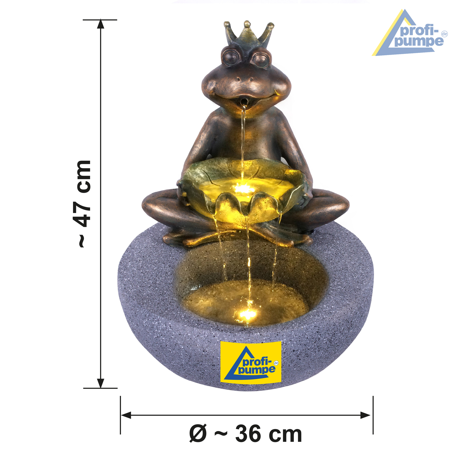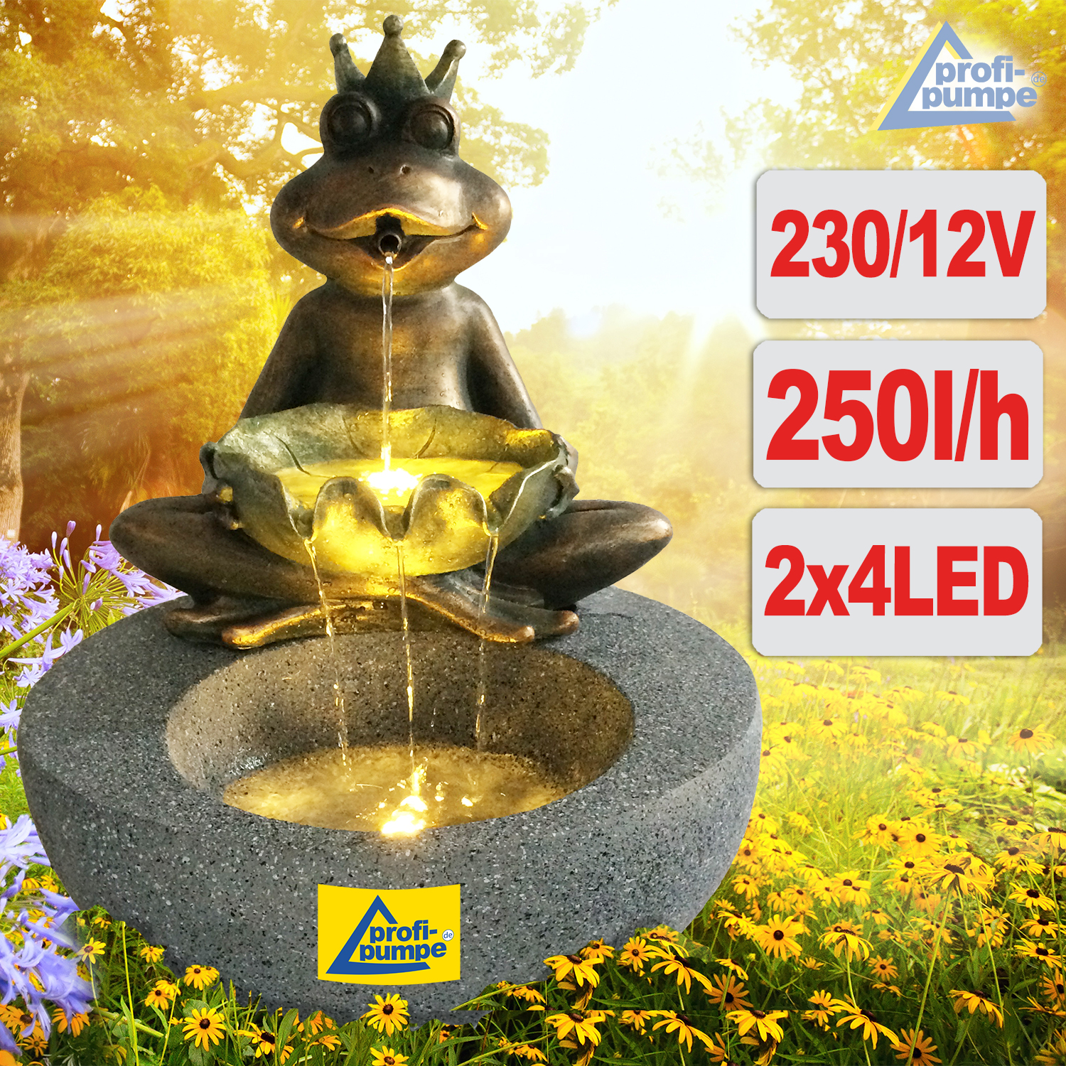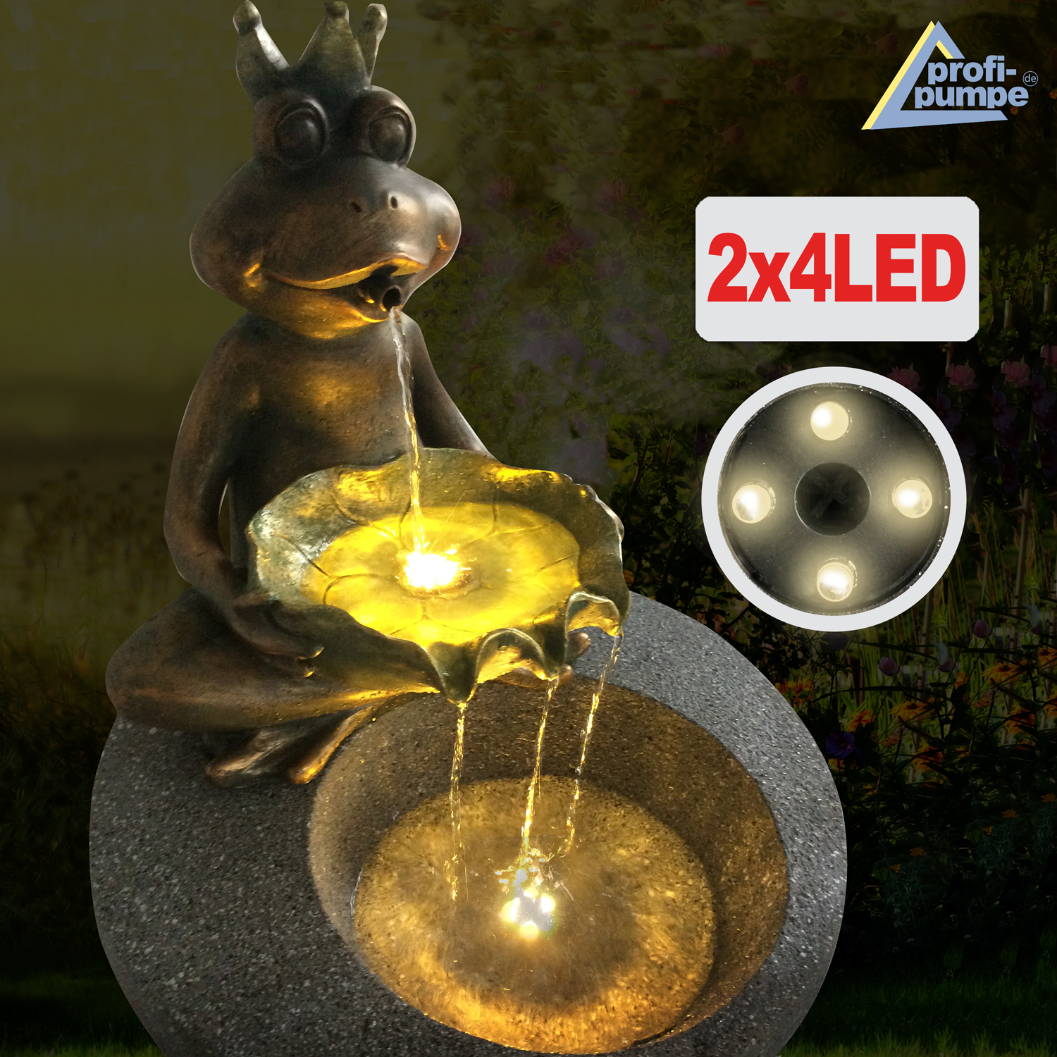 Der Brunnen “FROSCH-PRINZ” mit 2 austauschbaren LED-Leuchtringen (2*4) ist fรผr den Innen- und Auรenbereich geeignet. Betrieben wird der stilvolle Wasserbrunnen mit einem 230/12-Volt Netzadapter. Der moderne Gartenbrunnen sorgt fรผr eine harmonische Atmosphรคre und Entspannung. Das Lebenselixier Wasser belebt Wohnzimmer, Esszimmer, Flure und Eingangsbereiche, Wintergรคrten oder Balkone, Terrassen und Gรคrten im privaten wie gewerblichen Umfeld.
