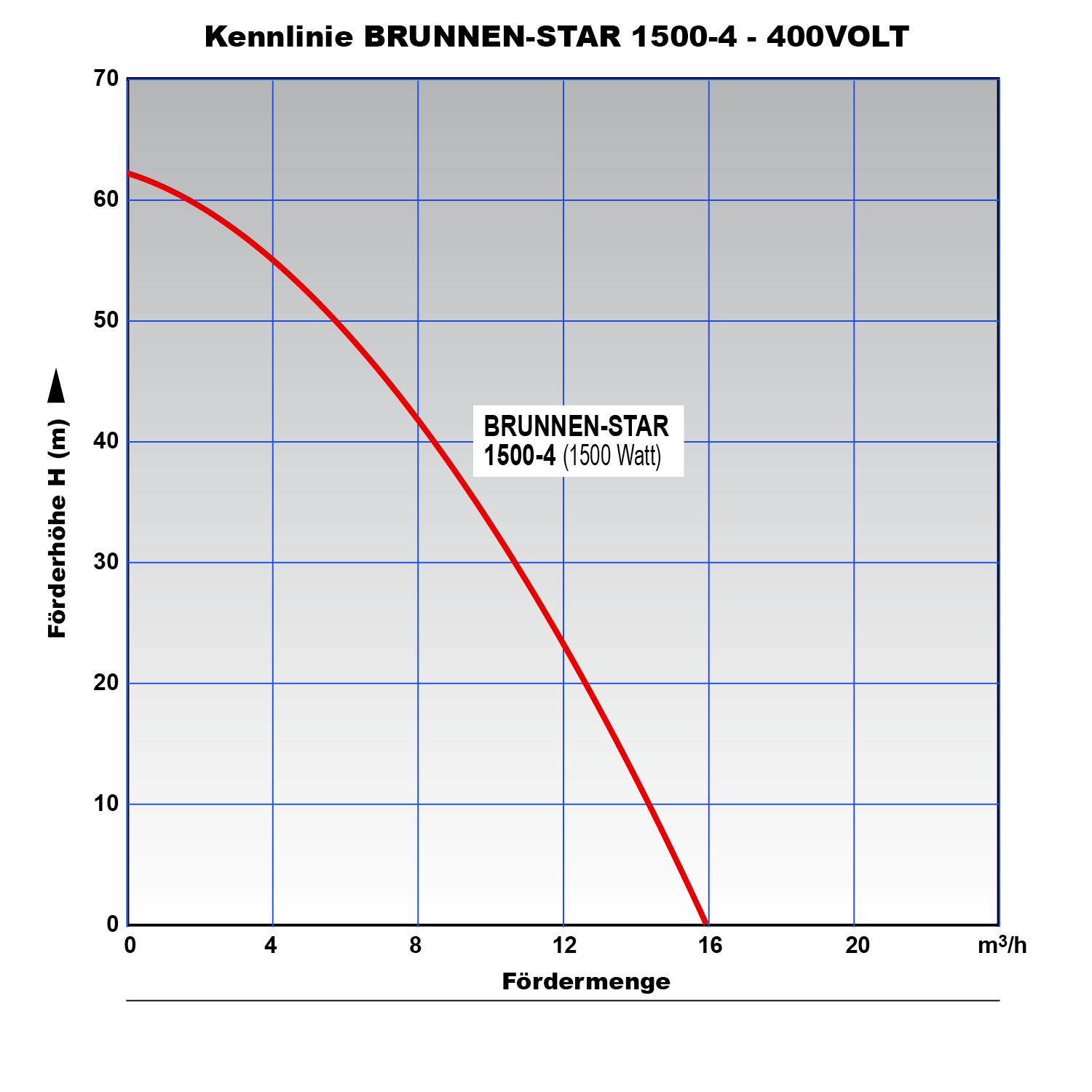 Die leistungsstarke Tiefbrunnenpumpe hat einen hochwertigen gekapselten Motor und erbringt Fรถrdermenge von bis zu 16.000l/h. Die maximale Fรถrderhรถhe betrรคgt 62m und der maximale Fรถrderdruck liegt bei 6,2bar. Bitte beachten Sie, dass die Fรถrderleistung bei steigender Fรถrderhรถhe entsprechend abnimmt.