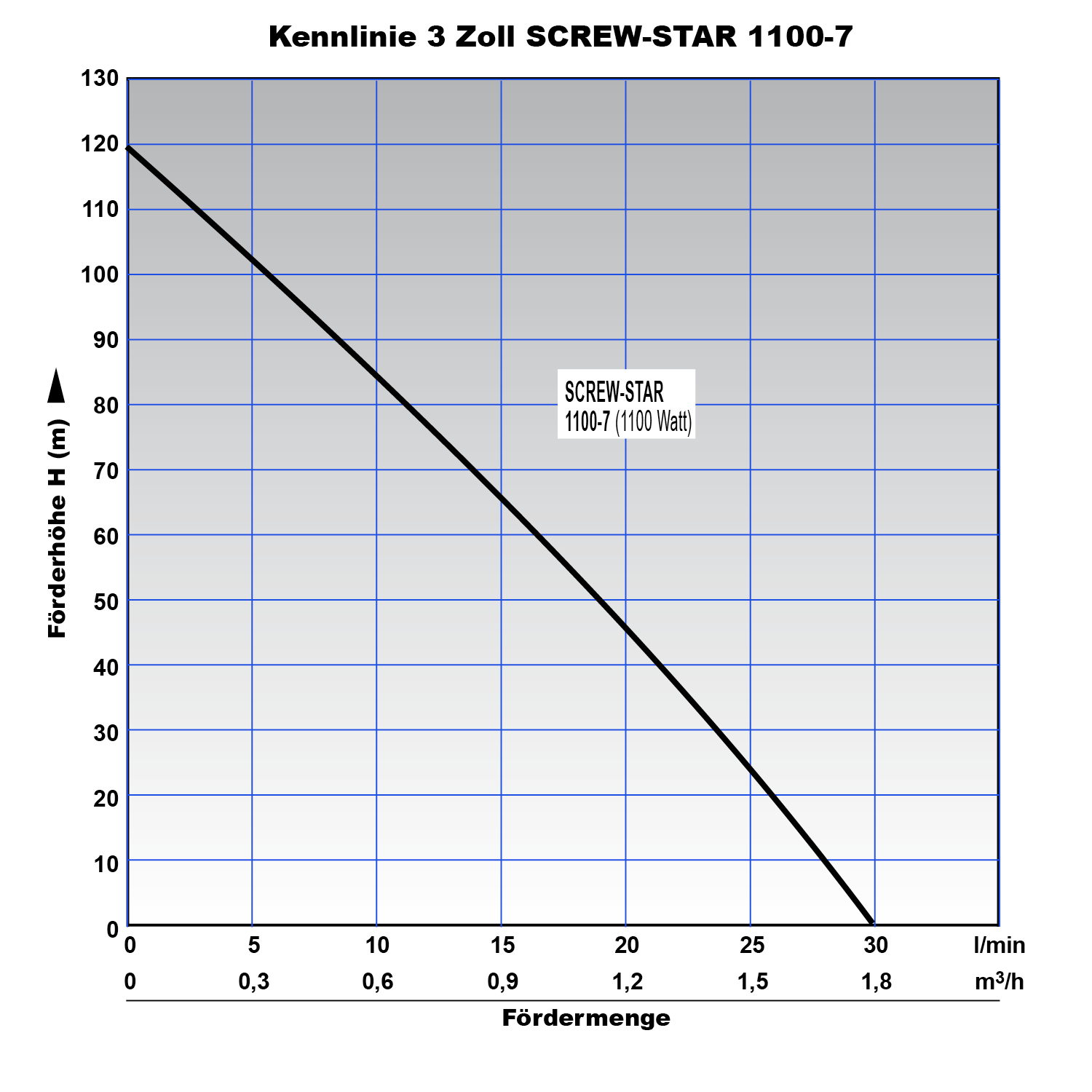 Die maximale Fรถrdermenge dieser sandvertrรคglichen Brunnenpumpe betrรคgt 1.800l/h, die maximale Fรถrderhรถhe 120m und der maximale Fรถrderdruck liegt bei 12 bar. Bitte beachten Sie, dass die Fรถrderleistung bei steigender Fรถrderhรถhe entsprechend abnimmt.