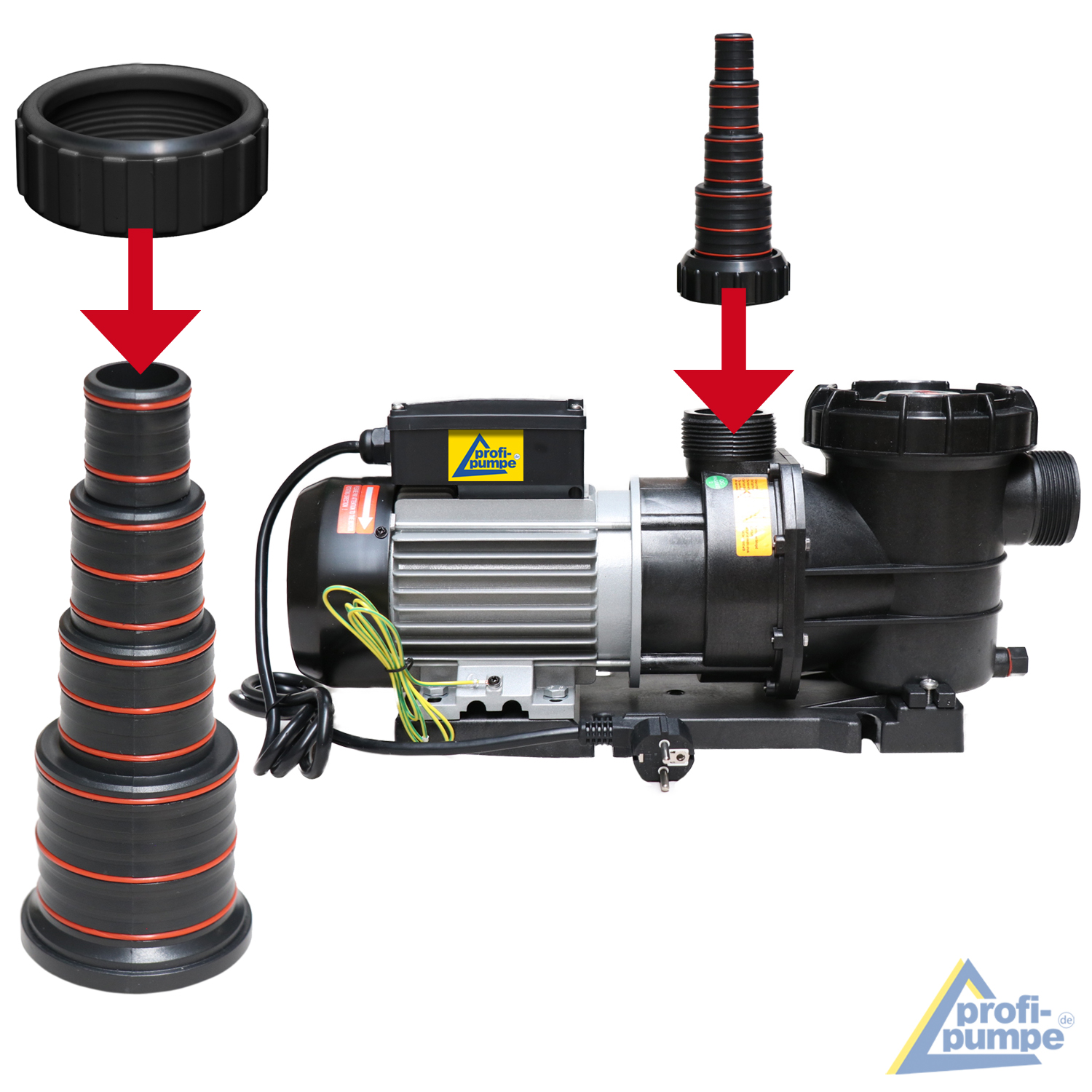 Die im Lieferumfang enthaltenen Stufenschlauchtรผllen erlauben die Verwendung unserer POOL-STAR-Poolpumpen unter unterschiedlichsten Einbausituationen.