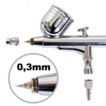 Die Airbrush-Pistole “Double-Action-Gun 130 D 0,3” ist ein Zweistoff-Zerstรคuber, der nach dem Prinzip einer Strahlpumpe arbeitet, wobei Druckluft als Treibmittel verwendet wird. In Abhรคngigkeit von der Stรคrke des Luftstroms und der Menge der Farbe, kann man mit einer Airbushpistole feinste Linien aber auch groรe Flรคchen malen. Man kann Farbe deckend aufsprรผhen aber auch einen transparenten Farbfilm airbrushen.