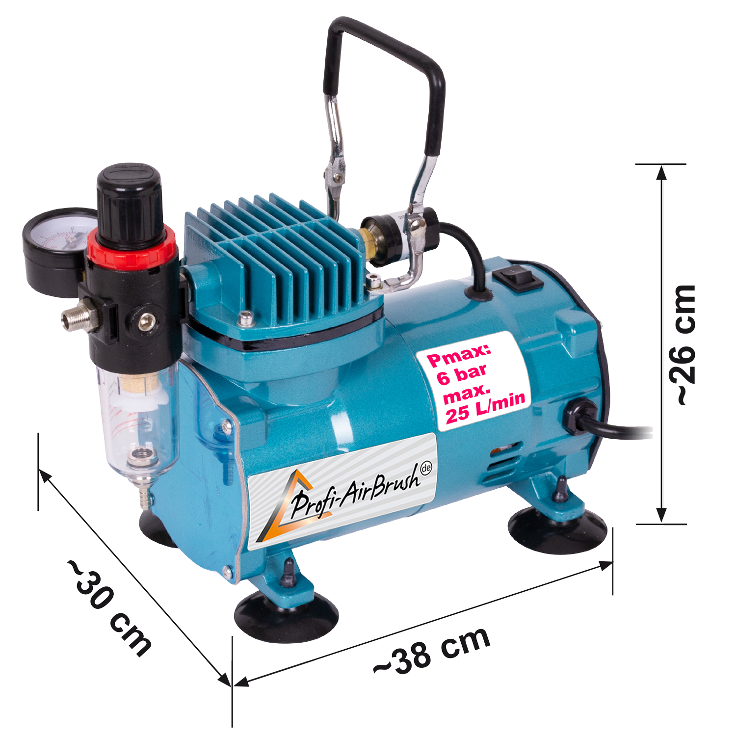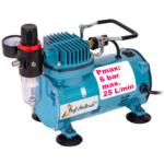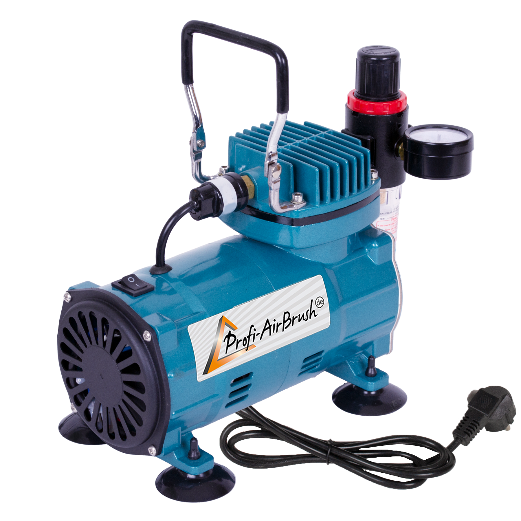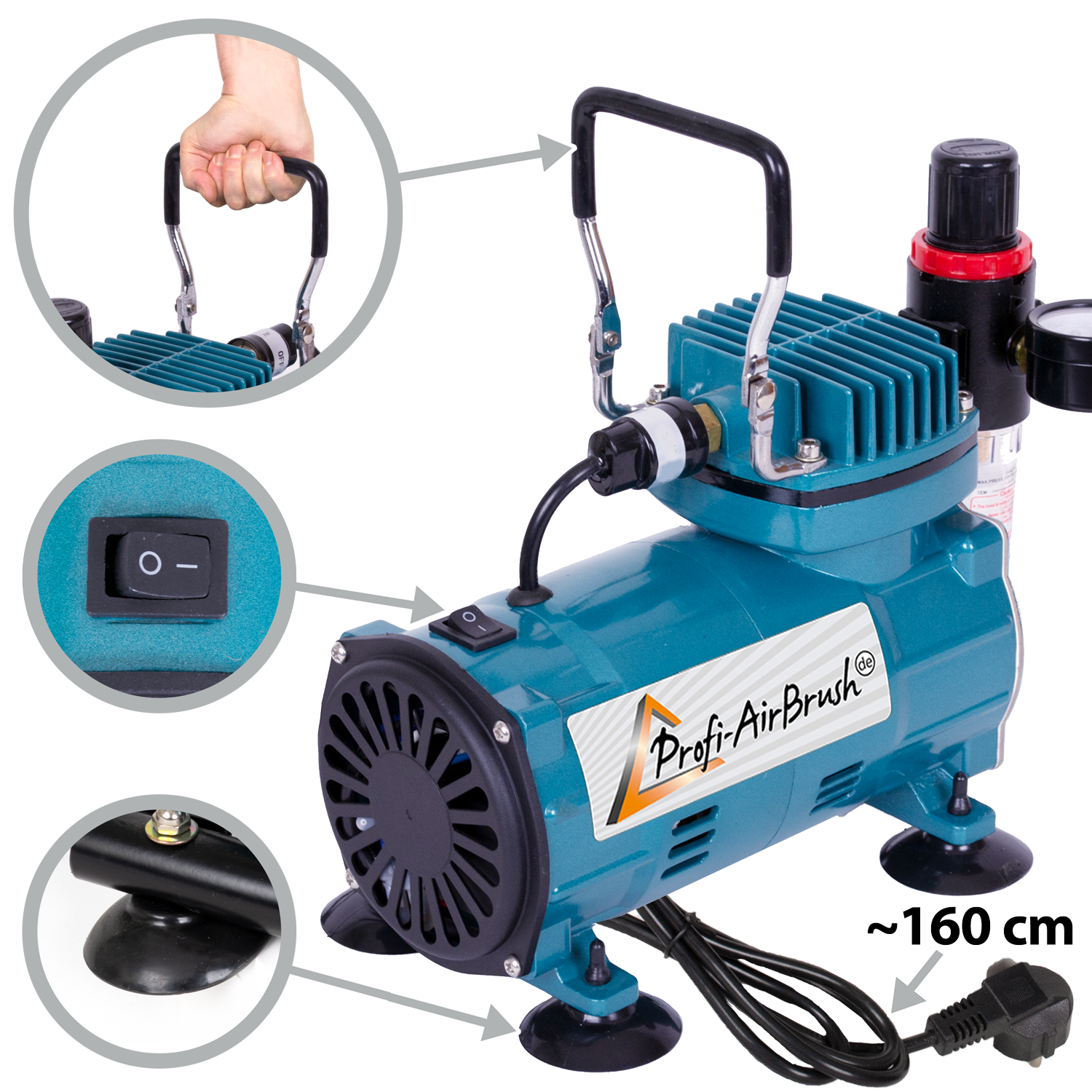 Das รถl- und wartungsfreie Airbrush Kompressor Set Compact Mobil ist fรผr Arbeiten mit allen handelsรผblichen Airbrush Farben geeignet. Mit nur 47dB ermรถglicht der Kompressor angenehmes Arbeiten auch in kleineren, geschlossenen Rรคumen. Sein kompaktes Design und der integrierte Tragegriff erleichtern den mobilen Einsatz. Die Abschaltautomatik ermรถglicht einen stromsparenden Betrieb.