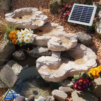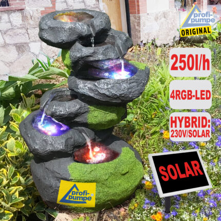 Gartenbrunnen FELS-KASKADE mit Pumpe und 4 RGB LED-Licht – Hybrid Solarbetrieb