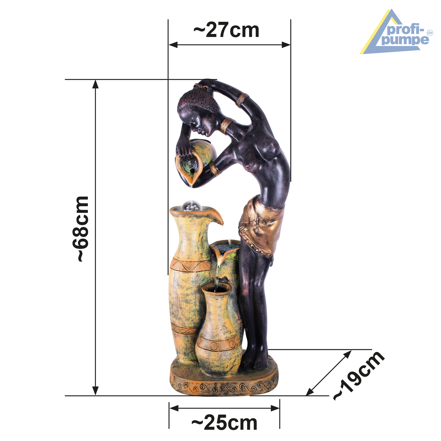 Der 230V – Gartenbrunnen & Wasserspiel “NAOMI” mit LED-Licht ist für den Innen- und Außenbereich geeignet. Betrieben wird der Garten- und Zimmerbrunnen mit einem 230/12-Volt Netzadapter. Der ansprechende Brunnen im Stil afrikanischer Kunst zaubert eine tolle Atmosphäre. Das Lebenselixier Wasser belebt Wohnzimmer, Esszimmer, Flure und Eingangsbereiche, Wintergärten oder Balkone, Terrassen und Gärten im privaten wie gewerblichen Umfeld.