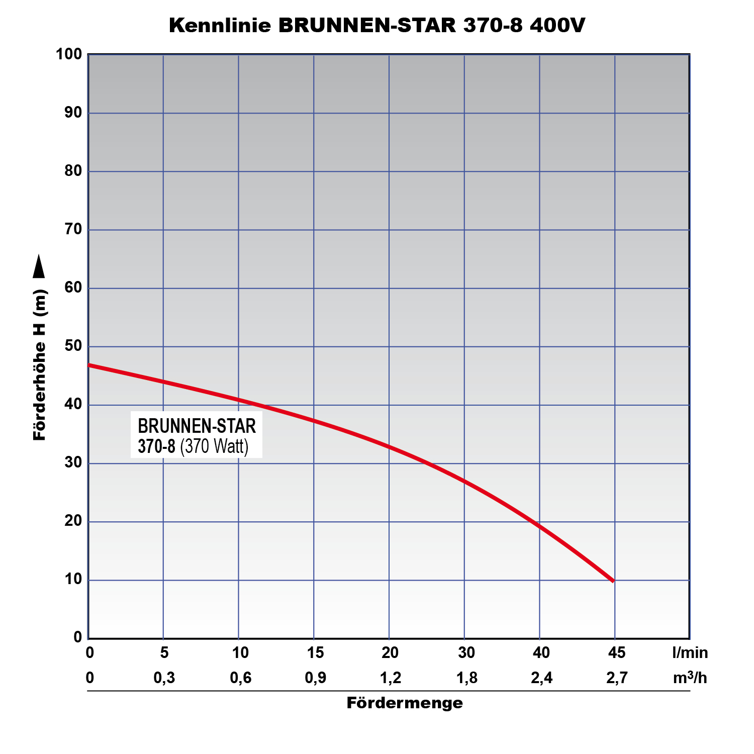 Diese 400V-Tiefbrunnenpumpe erbringt eine Leistung von 370 Watt. Die maximale Förderhöhe beträgt 42m,