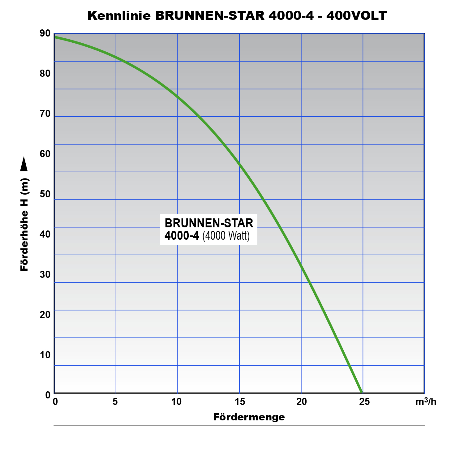 Die leistungsstarke Tiefbrunnenpumpe hat einen hochwertigen gekapselten Motor und erbringt Fördermenge von bis zu 25.000l/h. Die maximale Förderhöhe beträgt 89m und der maximale Förderdruck liegt bei 8,9bar. Bitte beachten Sie, dass die Förderleistung bei steigender Förderhöhe entsprechend abnimmt.
