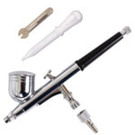 Die Airbrush-Pistole “Double-Action-Gun 130 D 0,3” ist ein Zweistoff-Zerstäuber, der nach dem Prinzip einer Strahlpumpe arbeitet, wobei Druckluft als Treibmittel verwendet wird. In Abhängigkeit von der Stärke des Luftstroms und der Menge der Farbe, kann man mit einer Airbushpistole feinste Linien aber auch große Flächen malen. Man kann Farbe deckend aufsprühen aber auch einen transparenten Farbfilm airbrushen.