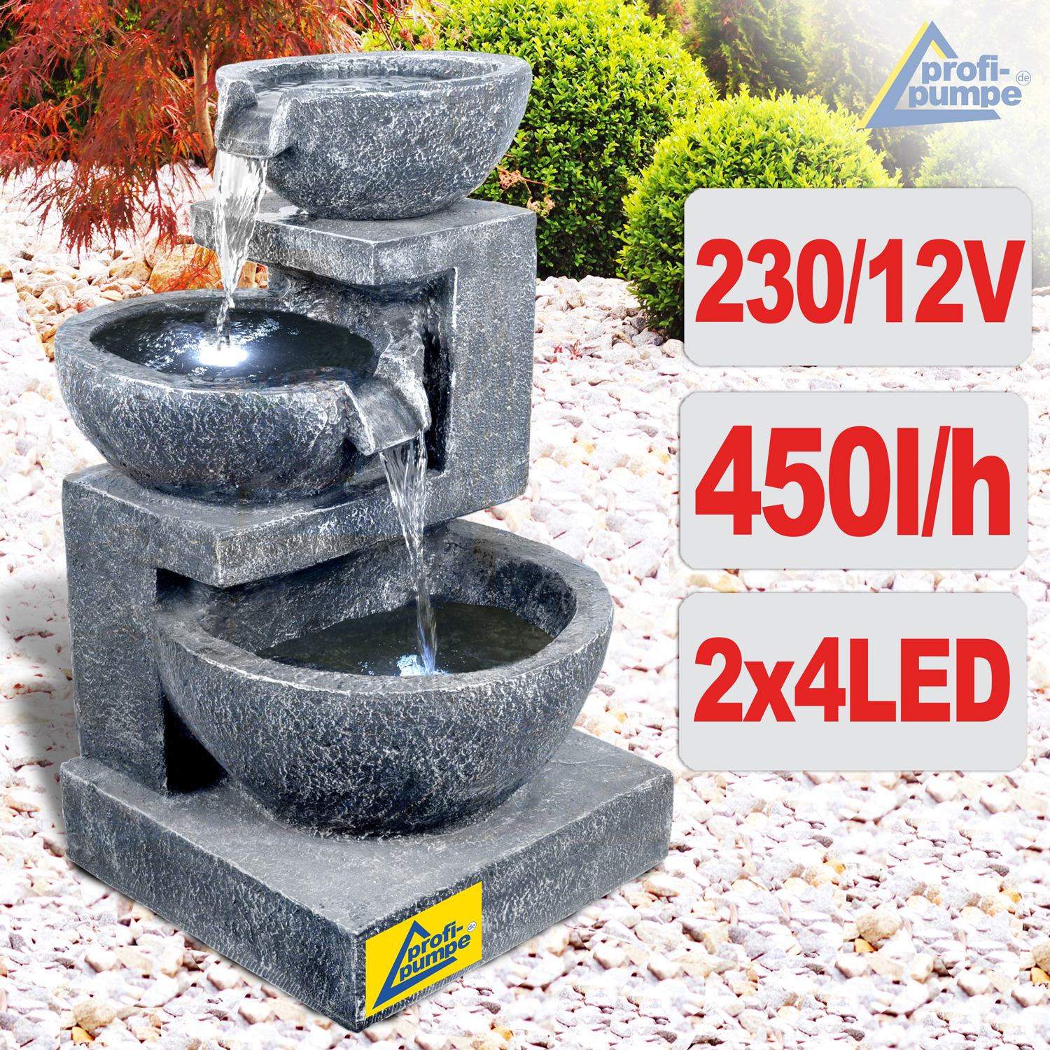 Der klassische B-Ware Gartenbrunnen & Wasserspiel “GRANITSCHALEN-KASKADE-3” mit LED-Licht ist für den Innen- und Außenbereich geeignet. Betrieben wird der Garten- und Zimmerbrunnen mit einem 230/12-Volt Netzadapter. Mit dem zeitlosen, klassischen Design zaubert der “GRANITSCHALEN-KASKADE-3” immer eine tolle Atmosphäre. Das Lebenselixier Wasser belebt Wohnzimmer, Esszimmer, Flure und Eingangsbereiche, Wintergärten oder Balkone, Terrassen und Gärten im privaten wie gewerblichen Umfeld.