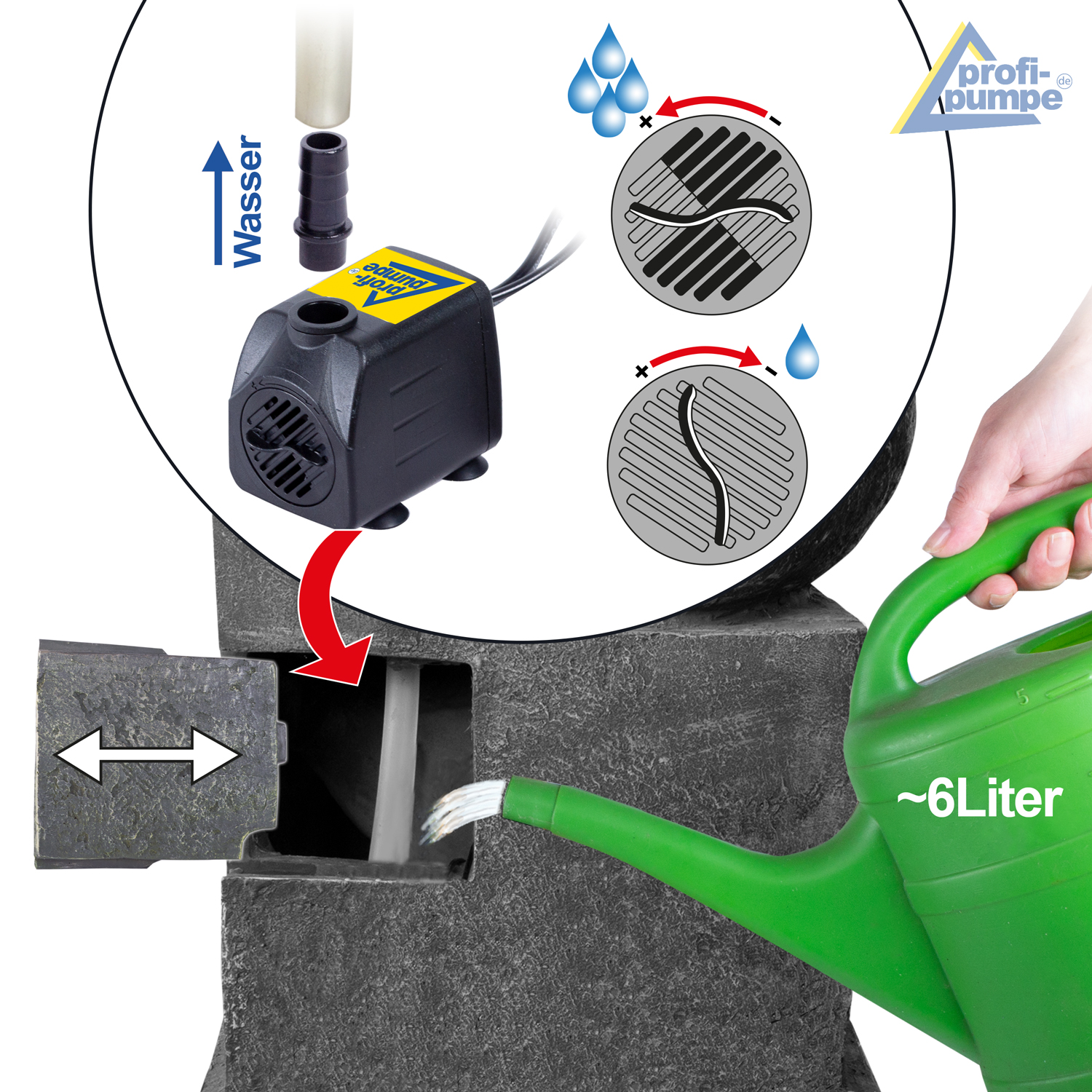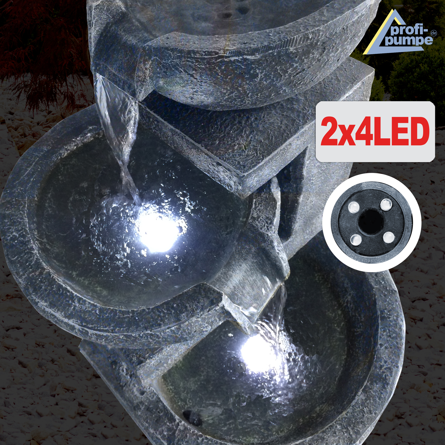 Der Gartenbrunnen ist sowohl bei Tag als auch bei Nacht der perfekte Blickfang. Die mitgelieferte LED-Beleuchtung sorgt für die perfekte Illumination.