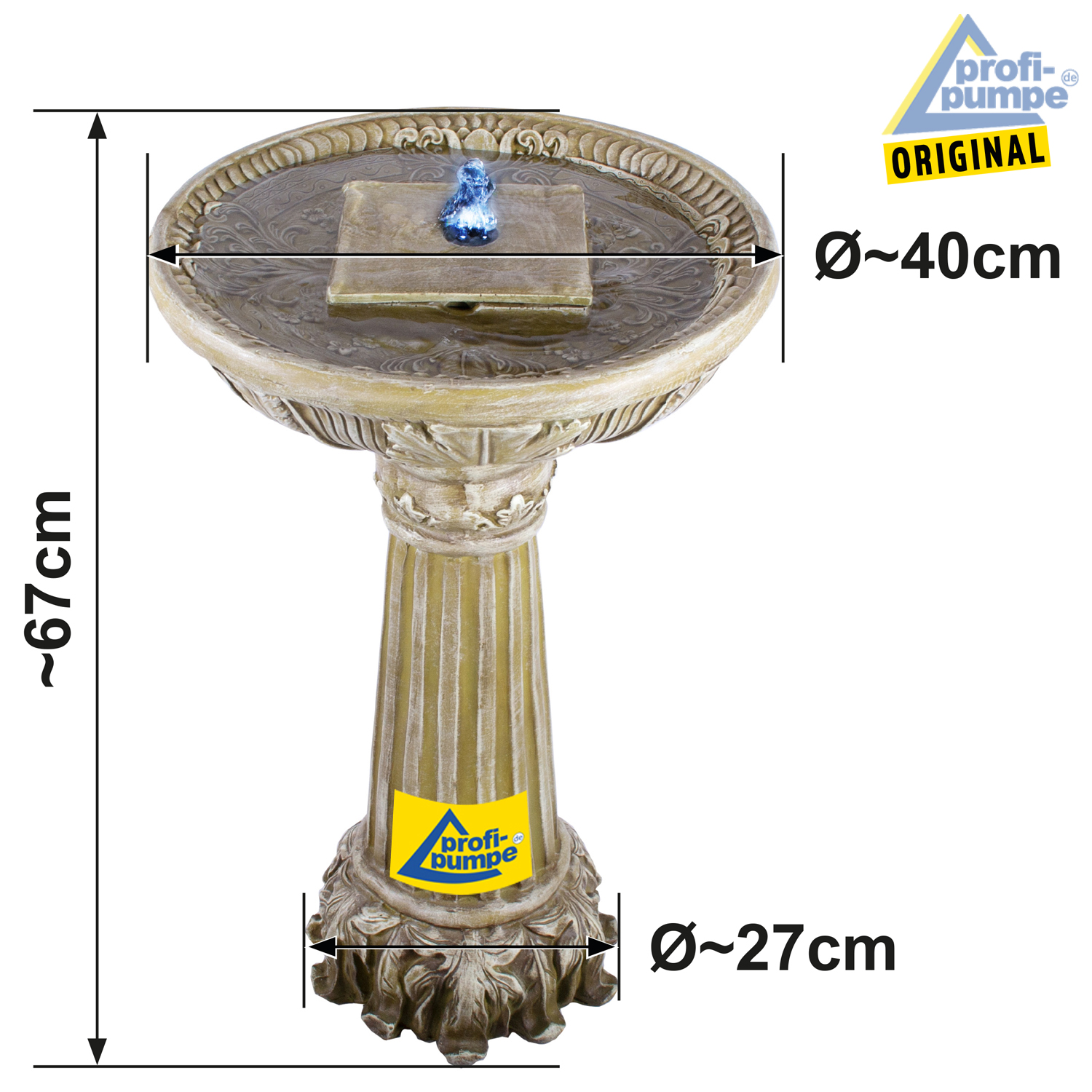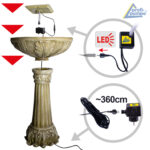 Der Zierbrunnen “LIEBES-BRUNNEN” ist für den 230-Volt-Betrieb vorgesehen. Die Pumpe wird mit sicherer 12V-Niederspannung betrieben (Adapter im Lieferumfang enthalten). Alle Kabelverbindungen sind verpolungssicher und wasserdicht. Der Aufbau geht einfach und schnell.