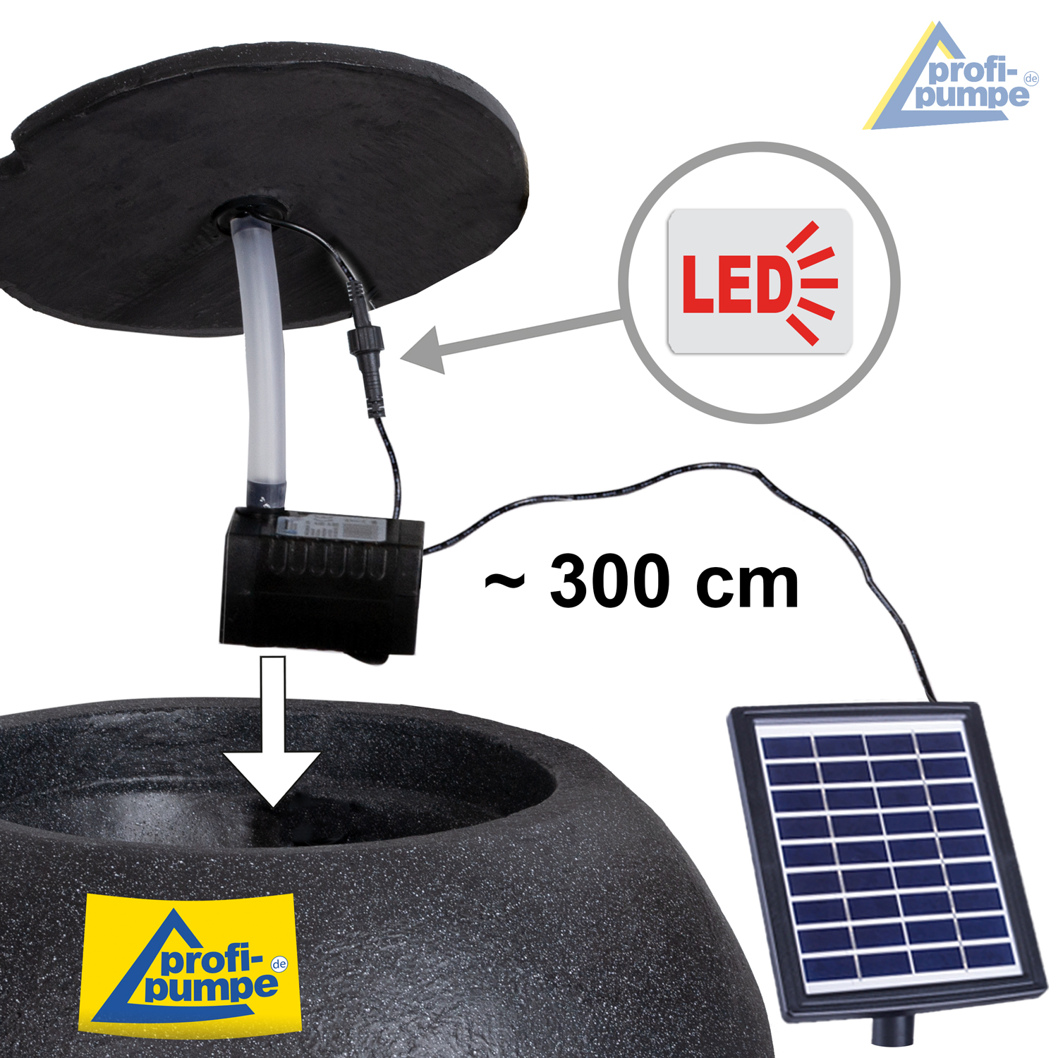 Hochwertiges, solarbetriebenes Pumpensystem für den Außenbereich – mit LED-Beleuchtung.