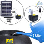Der Solargartenbrunnen kann am Tag aber auch in der Nacht betrieben werden. Der eingebaute Akku im Solarpanel lädt sich bei starken Sonnenlicht auf und speichert diese Energie für Tage mit schlechten Lichtverhältnissen oder nach Sonnenuntergang. Die maximale Förderleistung wird bei optimalen Bedingungen erreicht. Nach der Nacht schaltet sich die Pumpe bei ausreichenden Lichtverhältnissen automatisch in den Solarmodus. Die Akku-Funktion kann aber auch ausgeschaltet werden.