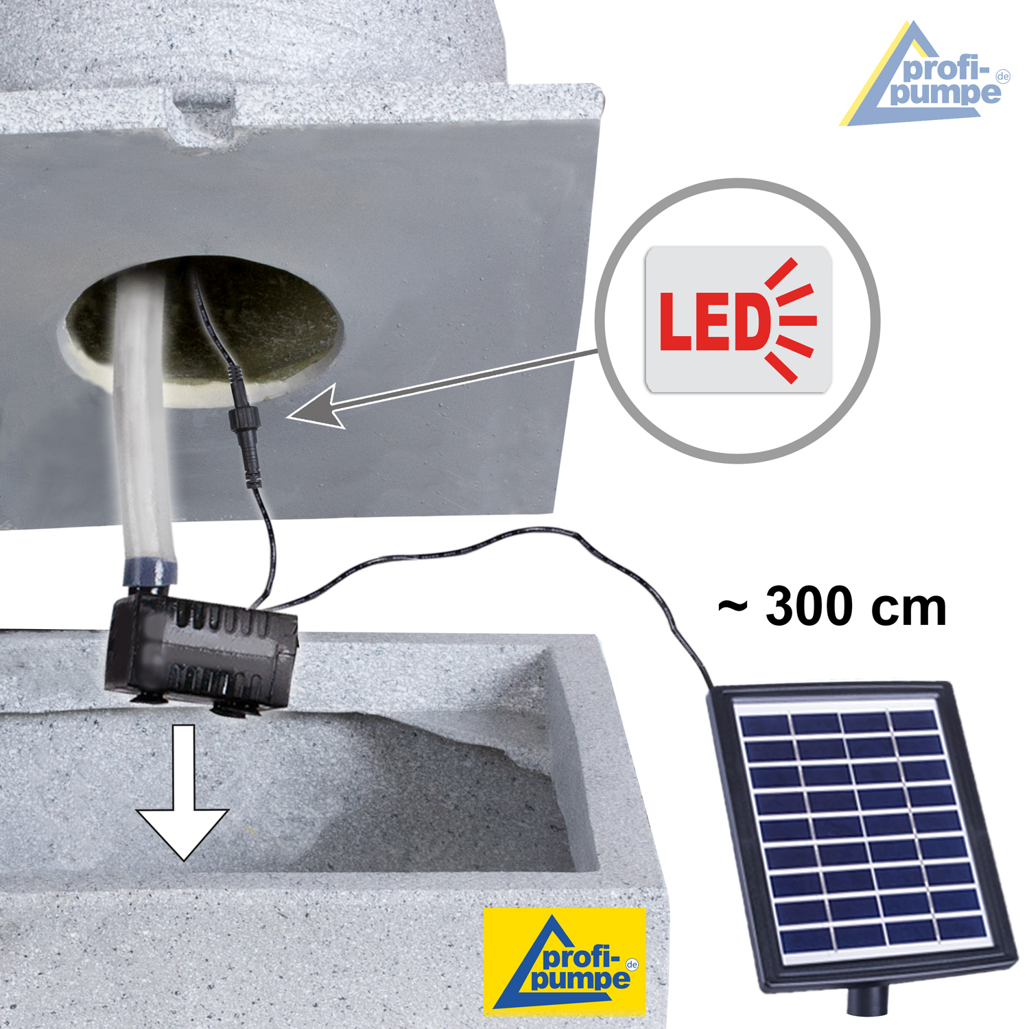 Hochwertiges, solarbetriebenes Pumpensystem für den Aussenbereich – mit LED-Beleuchtung.