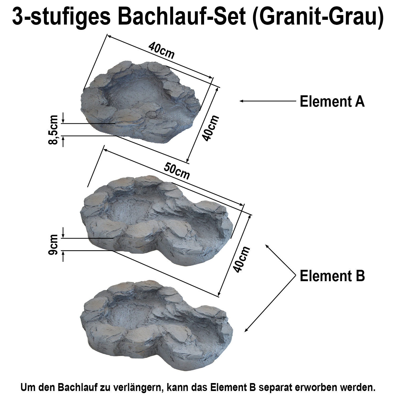 Der 3-teilige Gartenbrunnen Bachlauf QUELLBACH II besteht aus einer Schale mit Pumpenanschluss (obere Schale) und zwei großen Erweiterungs-Schalen. Die drei Schalen können beliebig zusammengesetzt und so den vorhandenen Platzverhältnissen optimal angepasst werden. Die massiven Schalen sind robust, schwer, frostsicher sowie wind- und wetterfest.