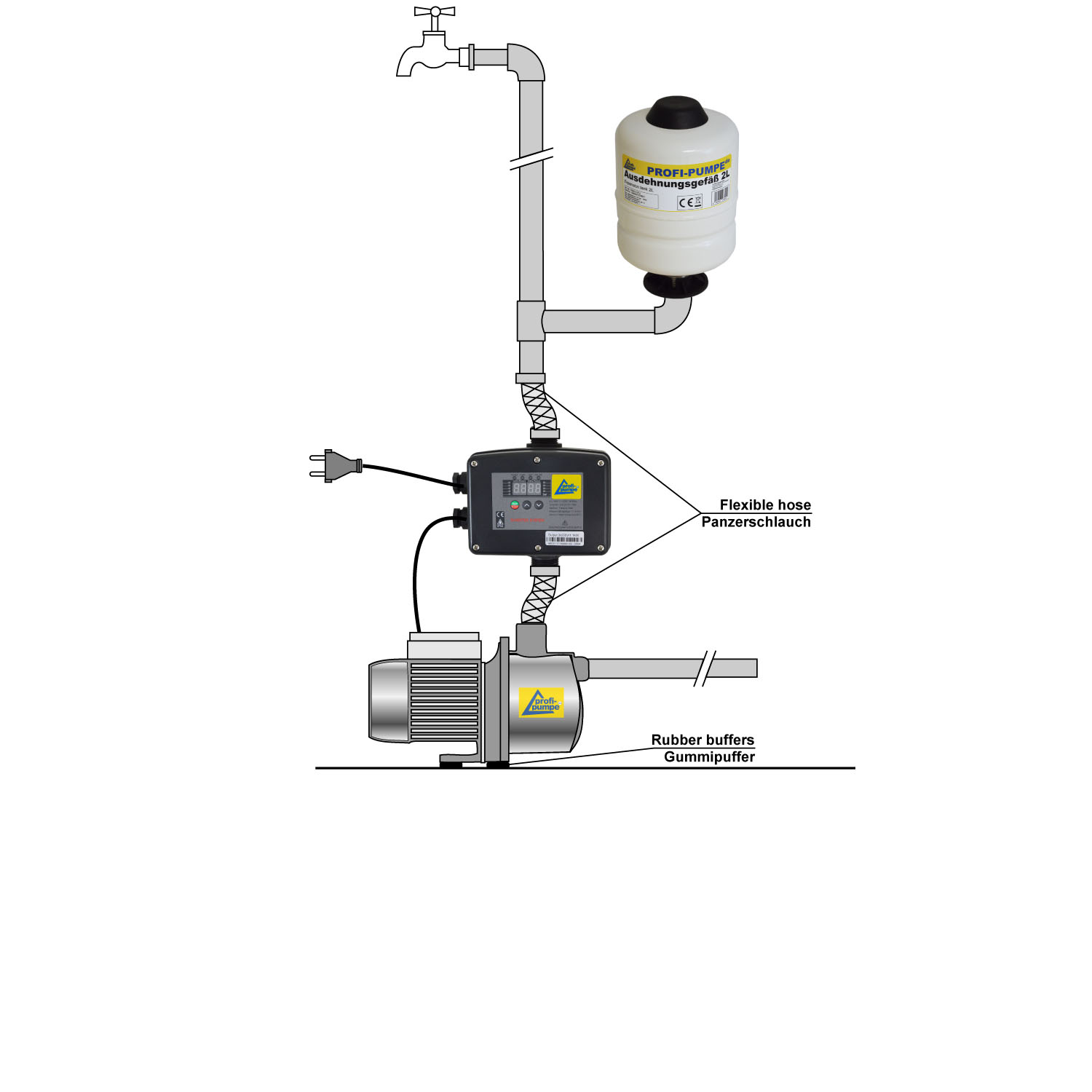 Die Inverter-Pumpensteuerung schaltet die Pumpe sanft ein und passt die Drehzahl der Pumpe dem eingestellten Druck an.