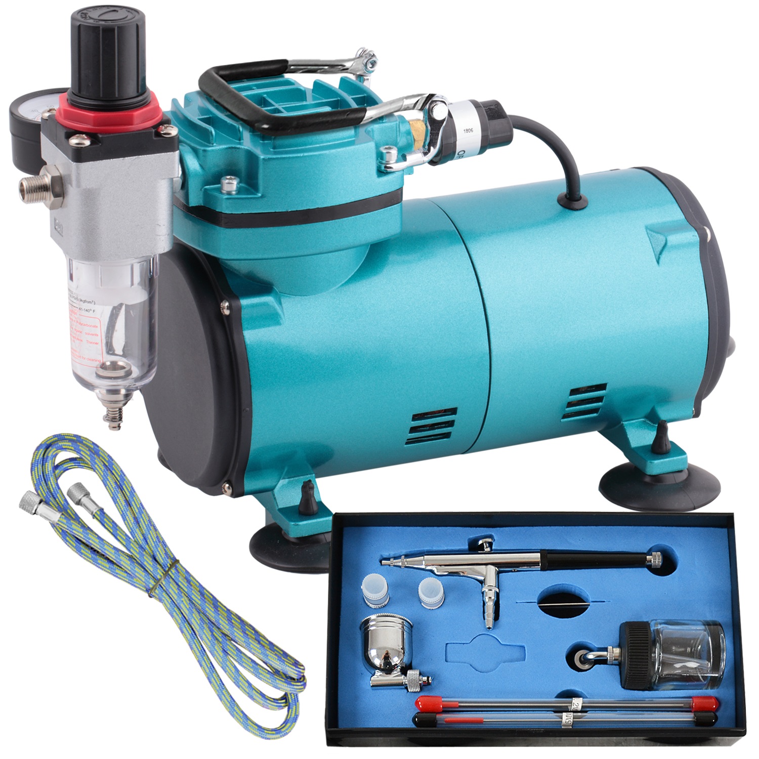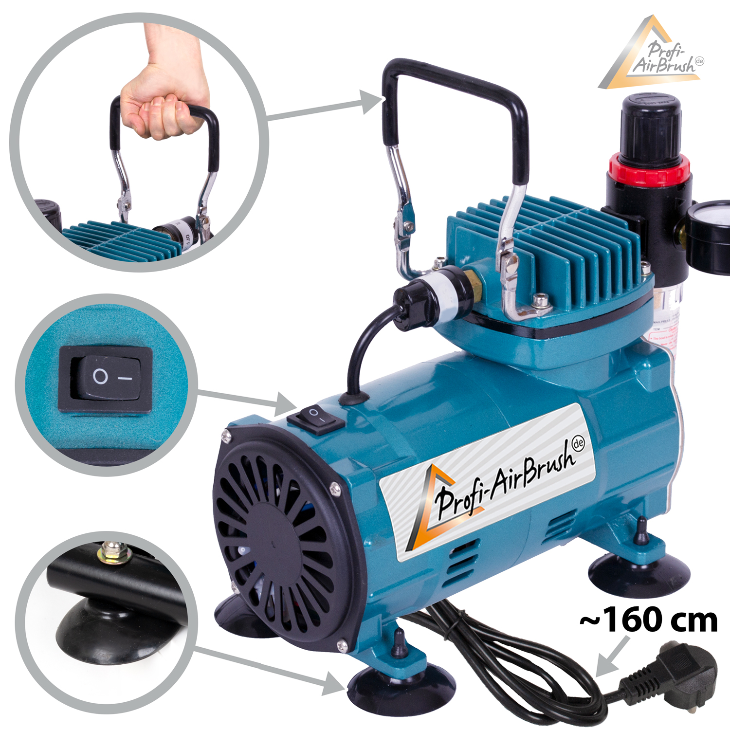 Dieser öl- und wartungsfreie Airbrush Kompressor Compact Set I ist für Arbeiten mit allen handelsüblichen Airbrush Farben geeignet. Mit nur 47dB ermöglicht er angenehmes Arbeiten auch in kleineren, geschlossenen Räumen. Sein kompaktes Design und der integrierte Tragegriff erleichtern den mobilen Einsatz. Die Abschaltautomatik ermöglicht einen stromsparenden Betrieb.