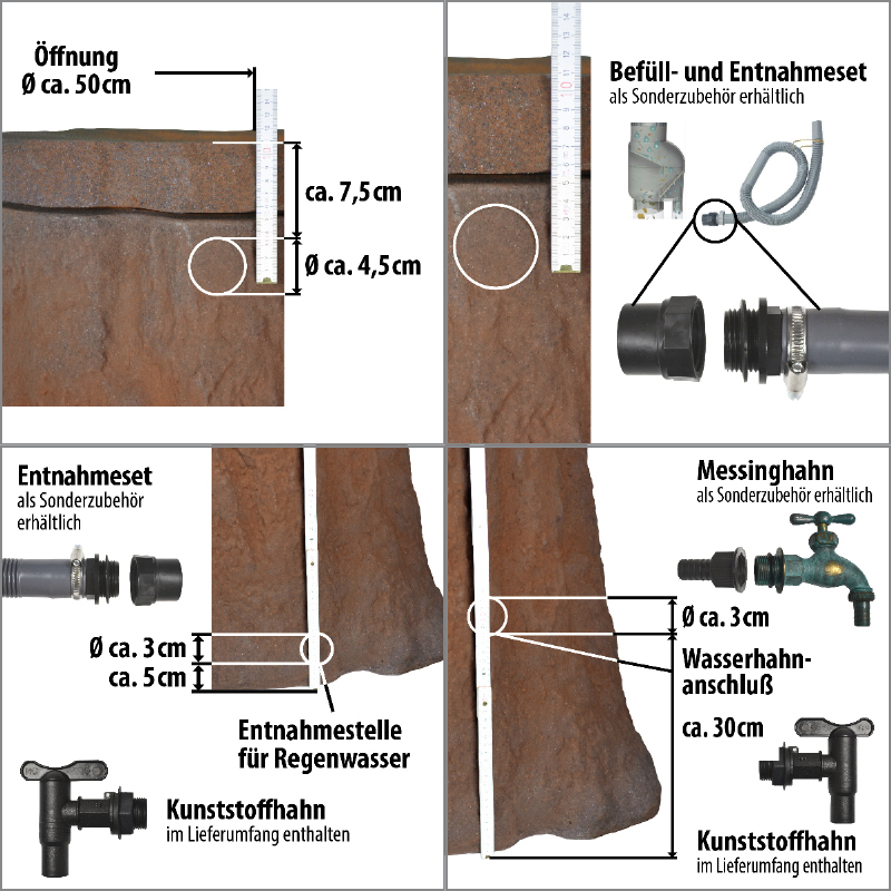 - Befüll- und Entnahmeset (Lieferung inkl. Filter T33 und allem Zubehör, wie oben sowie dem Entnahmeset, mit dem Sie das Wasser aus der Tonne restlos entnehmen können).