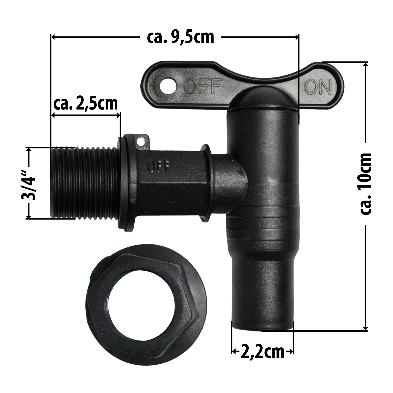 - Einen Auslaufhahn / Wasserhahn, matt oder poliert in 3/4 Zoll mit Schlauchtülle 12mm oder 17mm