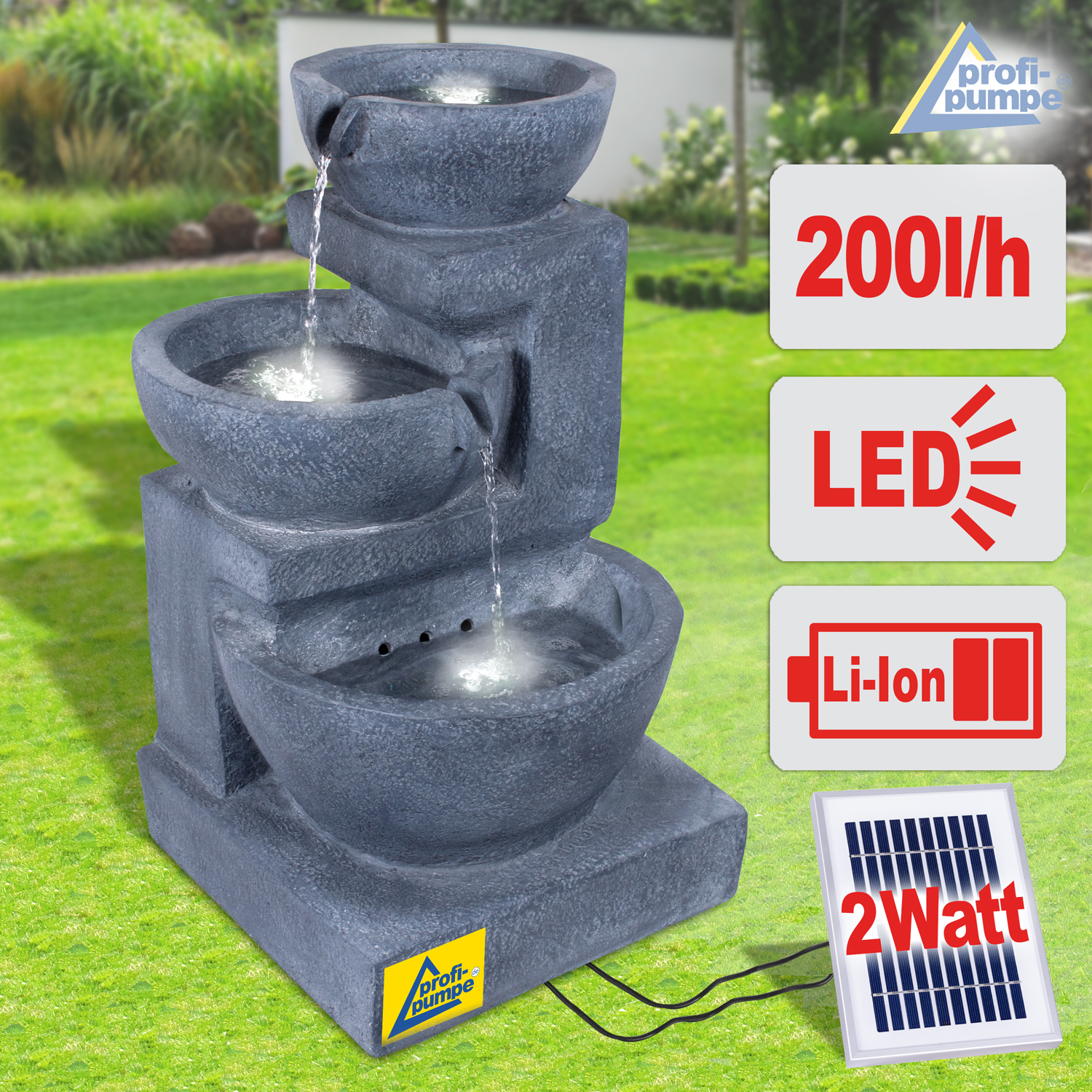 Solarbetriebener Garten-Brunnen mit Li-Ion Akku und LED-Lichter