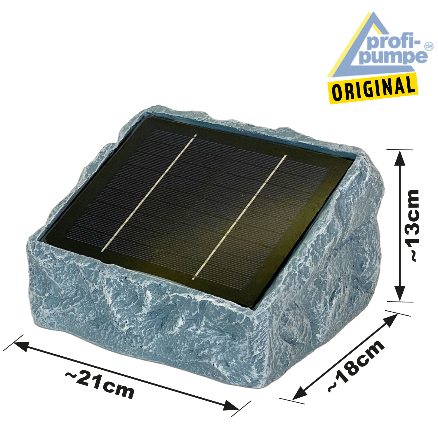 Das neue Teichpumpen-Set RÜGEN 200-1 ist die erste und einzige SOLARTEICHPUMPE im Steindesign mit LED-Licht und Akku. Neu ist auch das innovative Tag & Nacht Steuerungs- und Ladesystem. Ist gerade ausreichend Sonnenlicht vorhanden, so wird damit nur die Solarpumpe versorgt. Ist mehr Sonnenintensität vorhanden, als für den reinen Pumpenbetrieb nötig, so wird mit der überschüssigen Energie der Akku geladen. Sinkt an bewölkten Tagen die Sonnenintensität auf ein Minimum, so wird damit der Akku geladen, bis der Akku-Ladezustand ausreicht, um die Pumpe zu betreiben. Dann wird die Pumpe gestartet. Bei einsetzender Dämmerung und geladenem Akku wird automatisch auf Nachtbetrieb umgeschaltet. Das LED-Licht geht an und die Pumpe läuft bis zum Akku-Mindestentladezustand. Der Akku-Mindestladezustand gewährleistet eine lange AKKU-Lebensdauer. Am nächsten Tag wird wieder zunächst der Akku aufgeladen und dann die Pumpe (ohne Licht) gestartet. So haben Sie 100% mehr Freude an Ihrer Solarteichpumpe. Die Lebewesen im Teich werden dadurch bis zu 100% besser mit Sauerstoff versorgt und Ihr Teich bleibt vital! Unser KNOW-HOW-Vorsprung=GROSSE WIRKUNG zum SUPER-PREIS!