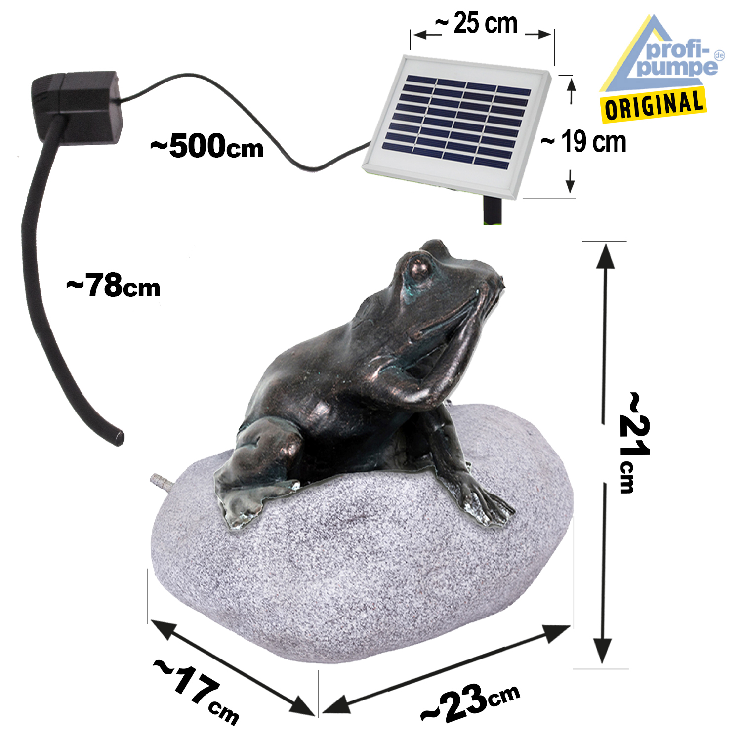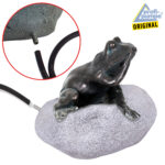 Der MÄRCHEN-FROSCH besticht durch seine formschöne Nachbildung und Oberfläche, die den Eindruck einer Kupferfigur mit leichtem Grünspan Ansatz entstehen lässt. Die Solar betriebene Pumpe fördert das Wasser aus dem Mund des “MÄRCHEN-FROSCH” in weitem Bogen wieder in das Gewässer zurück. Dieses Wasserspiel sieht nicht nur gut aus, es sorgt auch für eine gute Sauerstoffversorgung in Ihrem Teich.