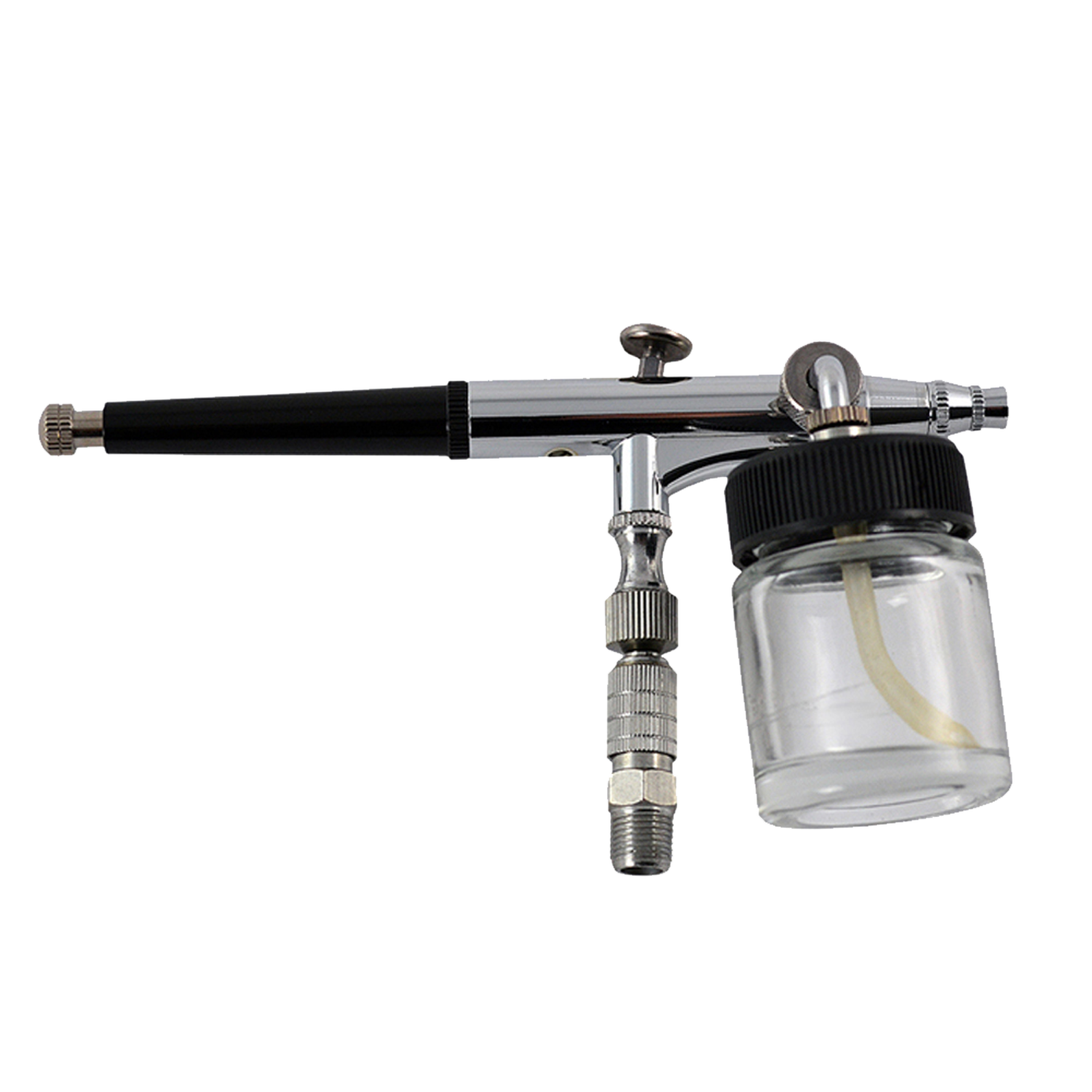 Ausgestattet mit 0,2mm / 0,3mm / 0,5mm NADEL/DÜSE Kombination und 2 verschiedenen Farbbehältern (7ml und 22ml) ist die Airbrush-Pistole “Double-Action-Gun 134s” besonders für den Beginner zum Kennenlernen der einzelnen Techniken und für ein zügiges Arbeiten optimal geeignet. Damit lassen sich sowohl feine Linien ziehen, als auch größere Flächen airbrushen. Für größere Farbmengen wird der 22ml-Glasbehälter und für kleinere Farbmengen der 7ml Metallaufsatz verwendet.