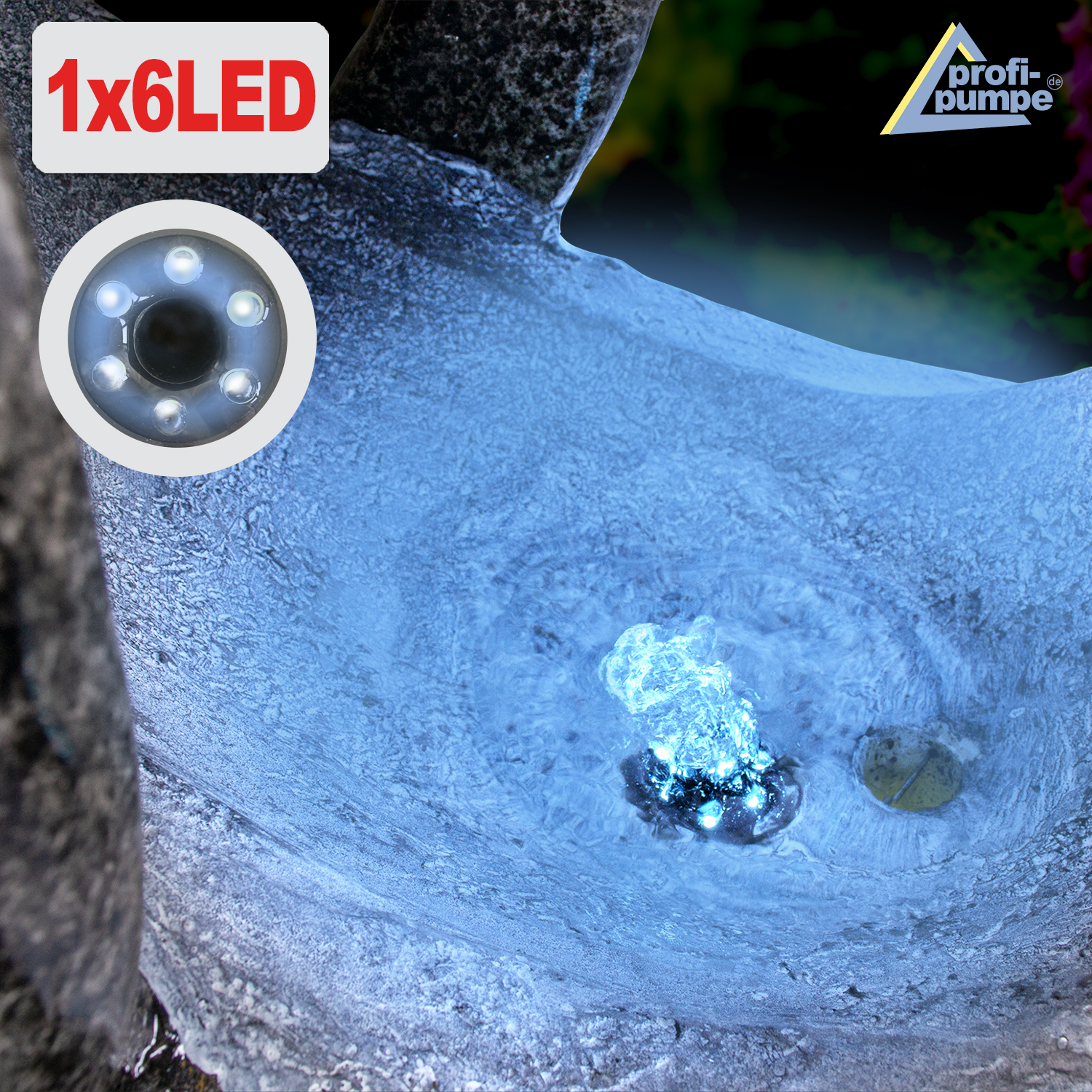 Der Garten- und Zimmerbrunnen ist sowohl bei Tag als auch bei Nacht der perfekte Hingucker. Die mitgelieferte LED-Beleuchtung sorgt für die perfekte Illumination. Die LED-Lichter des austauschbaren LED-Rings erstrahlen in einem kalten Weiß.