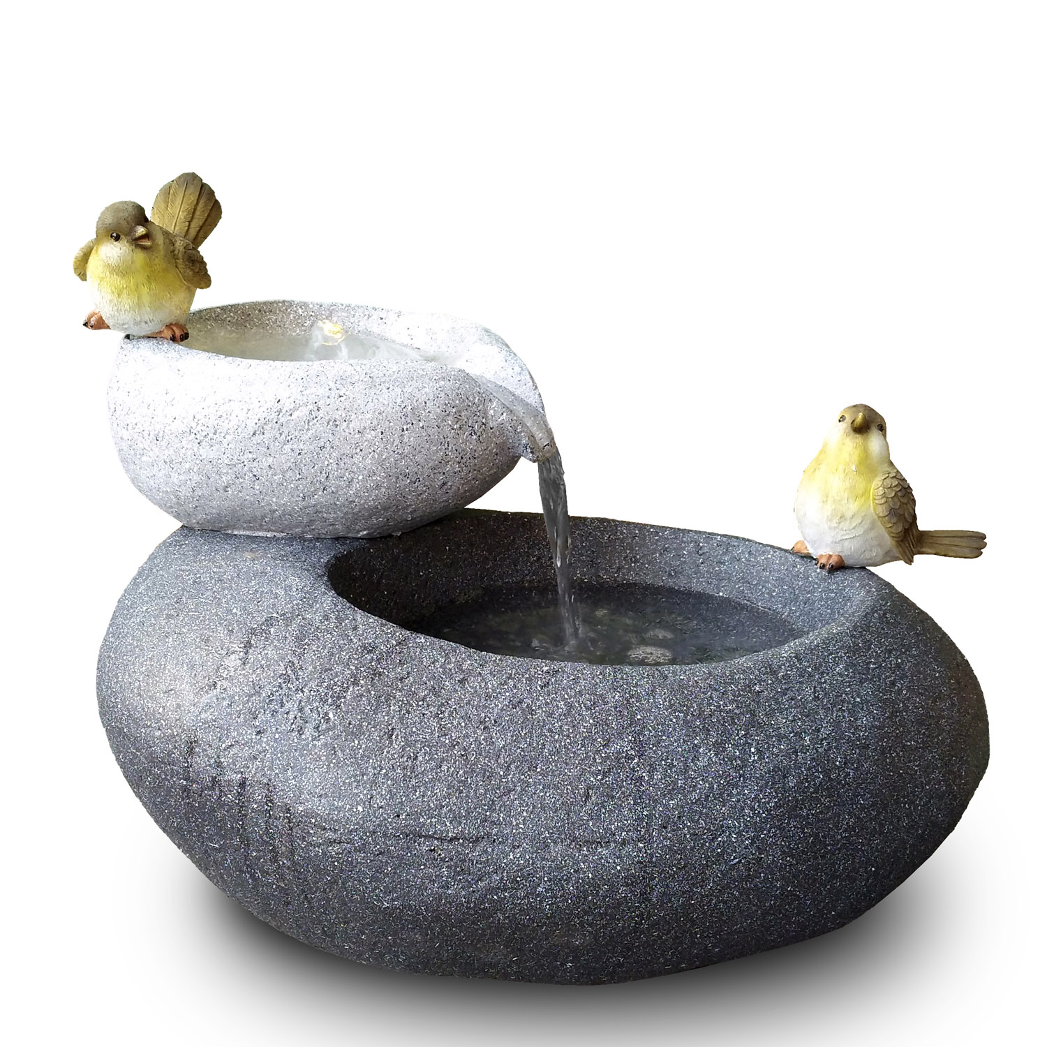 Der Brunnen FELS-SCHALEN ist für den Innen- und Außenbereich geeignet. Betrieben wird der hübsche Gartenbrunnen mit einem 230/12-Volt Netzadapter. Die zwei miteinander verbundenen Felsschalen in kompakter Ausführung finden überall Platz und sorgen mit den Vogelattrapen für gute Laune und Entspannung beim Betrachter. Das Lebenselixier Wasser belebt Wohnzimmer, Esszimmer, Flure und Eingangsbereiche, Wintergärten oder Balkone, Terrassen und Gärten im privaten wie gewerblichen Umfeld.